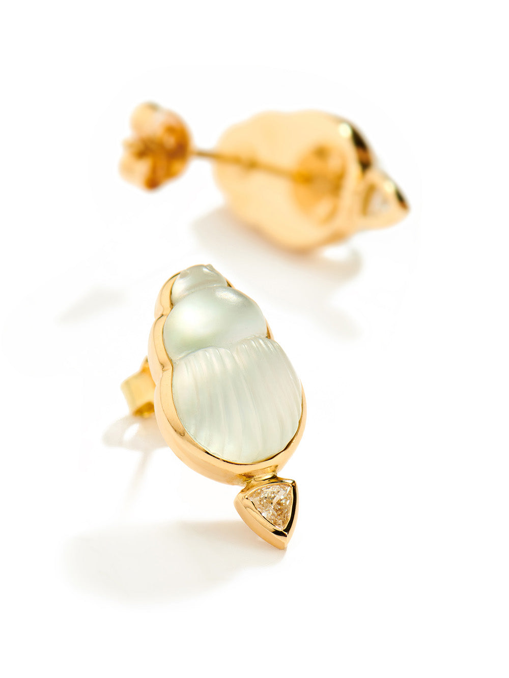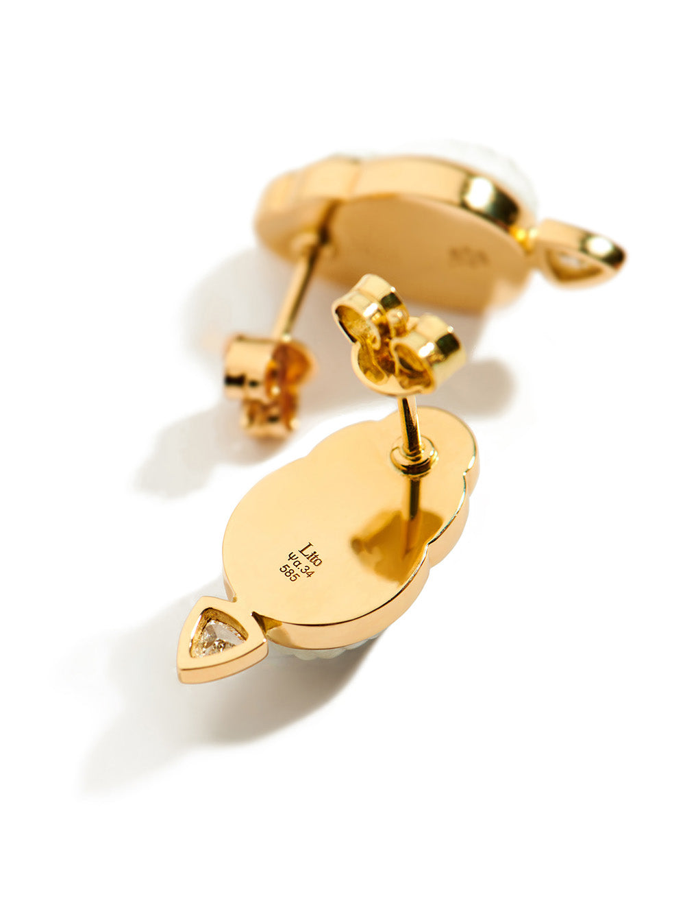 Boucles d'oreilles Chiara signées Lito confectionnées en nacre taillée en forme de scarabée le tout monté sur de l'or jaune 14 carats. Décorées de deux petits diamants en triangle à l'extrémité.