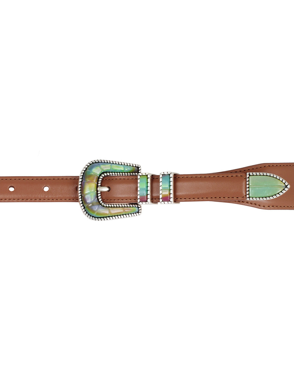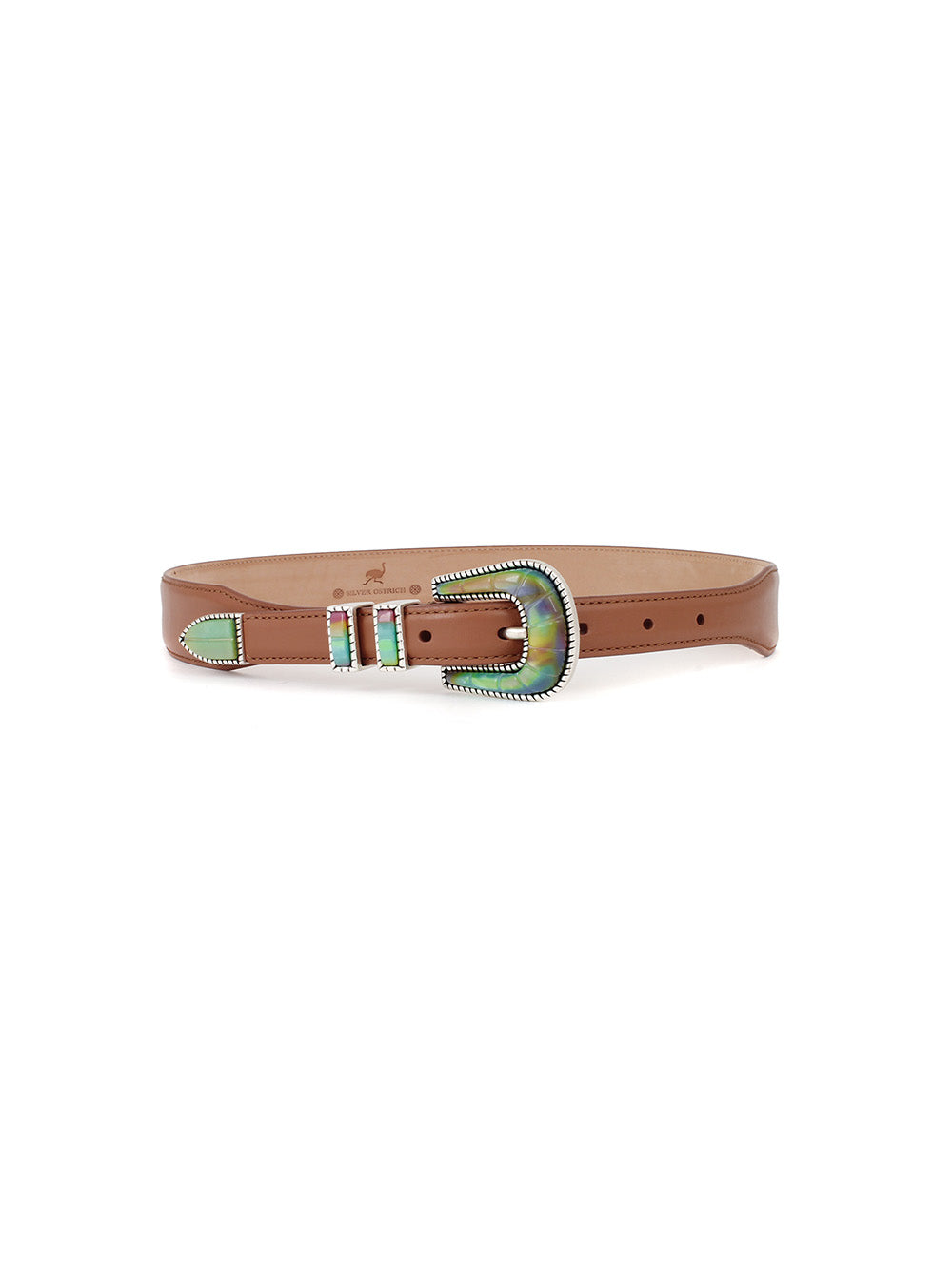 La ceinture Crazy de Silver Ostrich est entièrement fabriquée à la main en Italie. Cette version en cuir tan et boucle multicolore est une exclusivité By Marie.