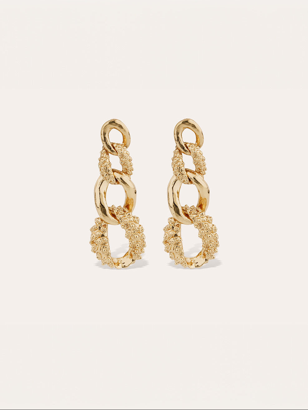Boucles d'oreilles Almara signées Gas Bijoux confectionnées à la main en métal doré à l'or fin. Un assemblage de 4 maillons martelés ou à la texture inspirée de la roche sculptée par la mer.