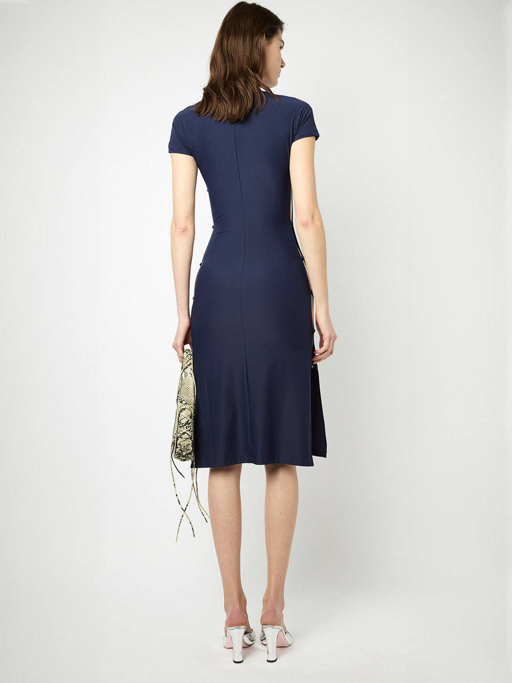 Robe Tchikiboum signée Marcia Wear confectionnée en nylon italien recyclé bleu marine. Une robe longue près du corps, accompagnée de deux grandes fentes à boutons sur les côtés. Une robe glamour au col inspiré des robes cheongsam.