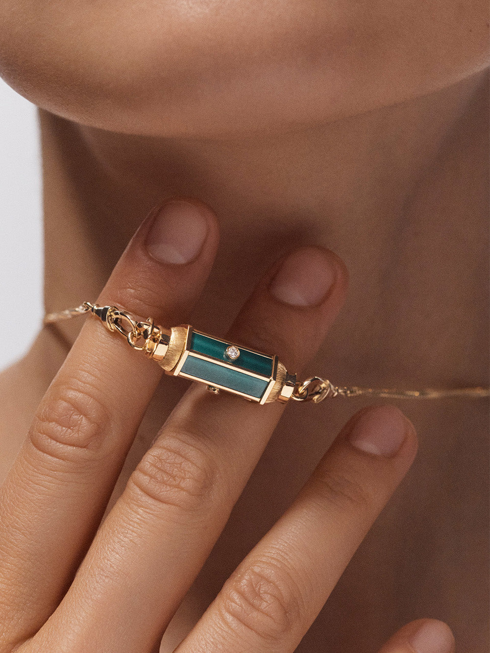 Baby Locket signé Marie Lichtenberg confectionné en or jaune 18 carats brossé sur les côtés. Un pendentif en malachite sertie de diamants. - Diamants : 0.11 carat - Malachite : 0.93 carat - Dimension du pendentif : 2,8cm x 1cm - Chaque pierre est unique ainsi, les détails sur la jaspe rouge peuvent varier d'une pièce à une autre. - Pièce garantie 2 ans à compter de la date d’achat sur présentation de la facture - Envoyé dans un écrin de joaillerie avec certificat d'authenticité