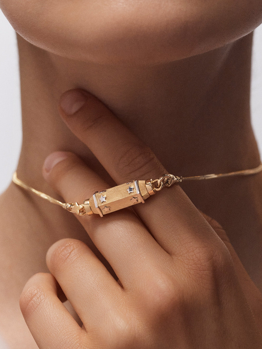 Baby Locket Star signée Marie Lichtenberg confectionné en or jaune brossé 18 carats décoré d'étoiles en or blanc poli. Ouverture par mousquetons signatures au niveau du locket. - Longueur de la chaîne : 37cm - Dimensions locket : 2,8cm x 1cm - Pièce garantie 2 ans à compter de la date d’achat sur présentation de la facture - Envoyé dans un écrin de joaillerie avec certificat d'authenticité