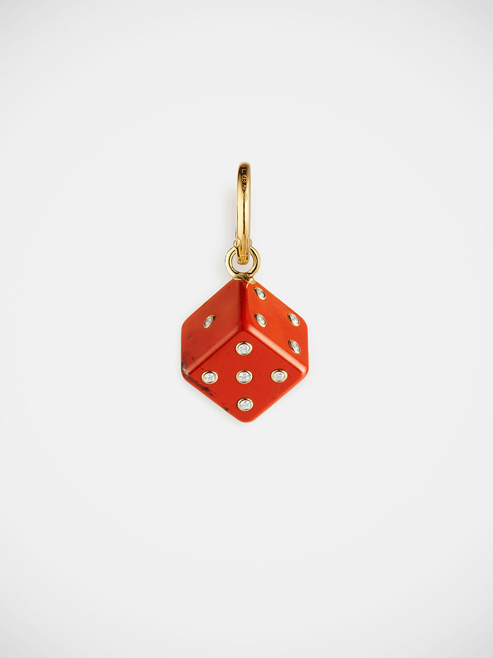 Le pendentif Dado Jaspe 11 mm signé Marie Lichtenberg est réalisé en jaspe rouge serti de diamants blancs, à la manière d'un dé à jouer. Vendu avec un fermoir et une créole, il peut être porté soit en pendentif, soit en boucle d'oreille.