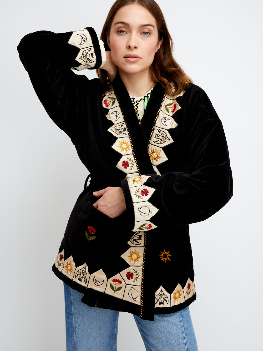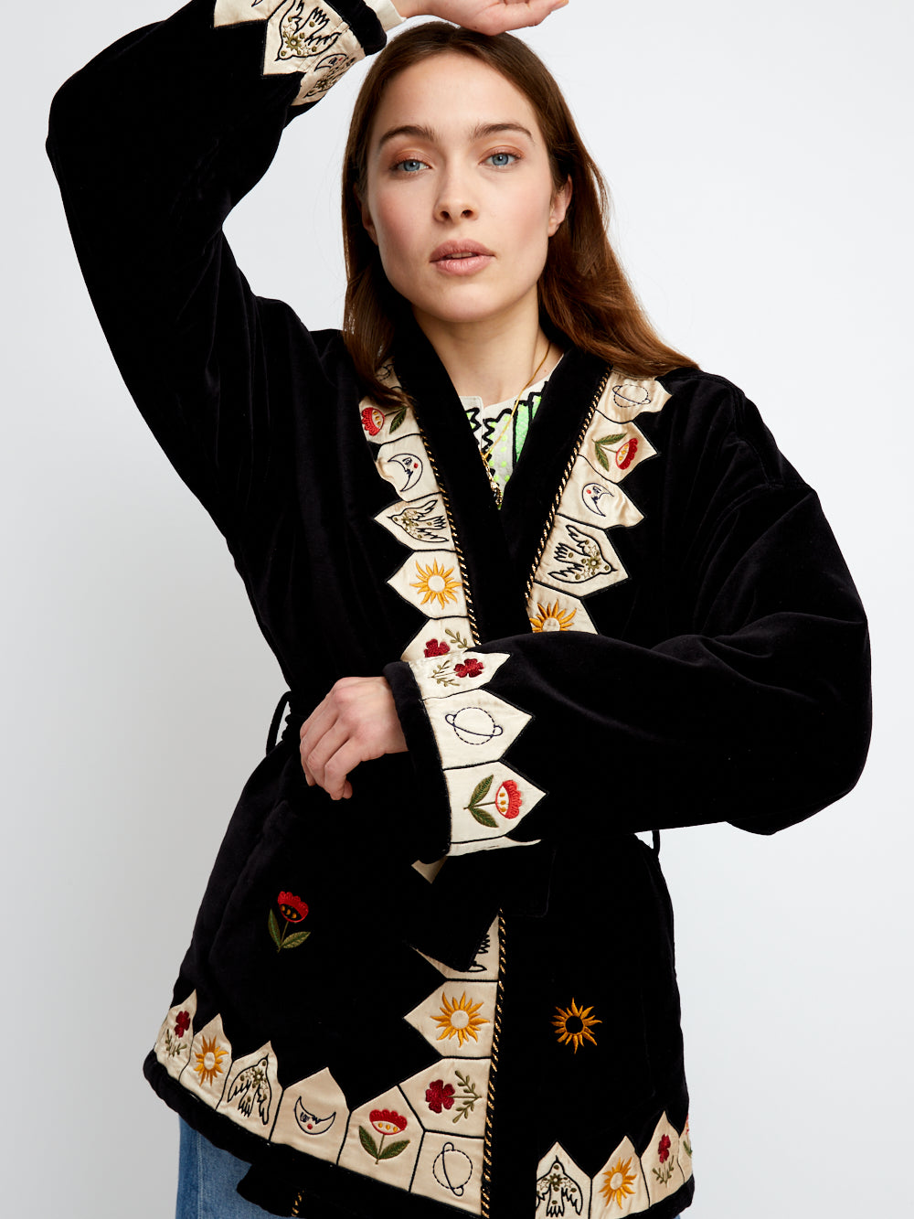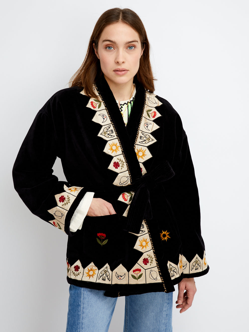 Kimono Moonlight singé Monoki confectionné dans un tissu velours de couleur noire rehaussé par des empiècements en soie dorée brodées à la main. Un kimono oversized, un classique de la marque.