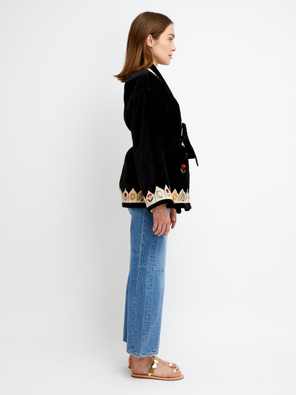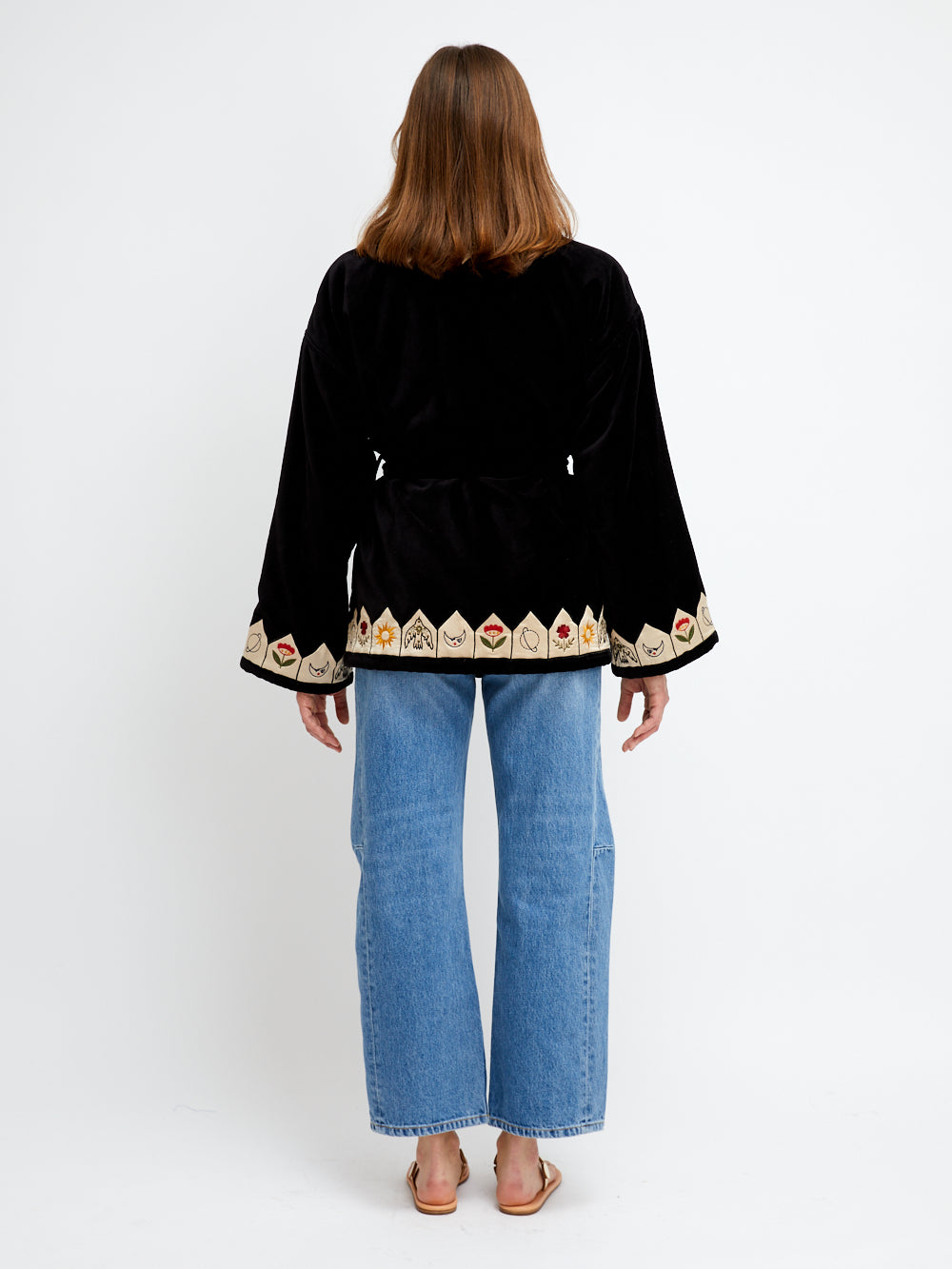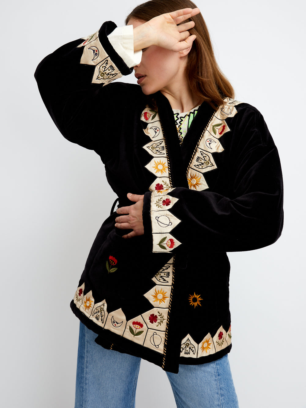 Kimono Moonlight singé Monoki confectionné dans un tissu velours de couleur noire rehaussé par des empiècements en soie dorée brodées à la main. Un kimono oversized, un classique de la marque.