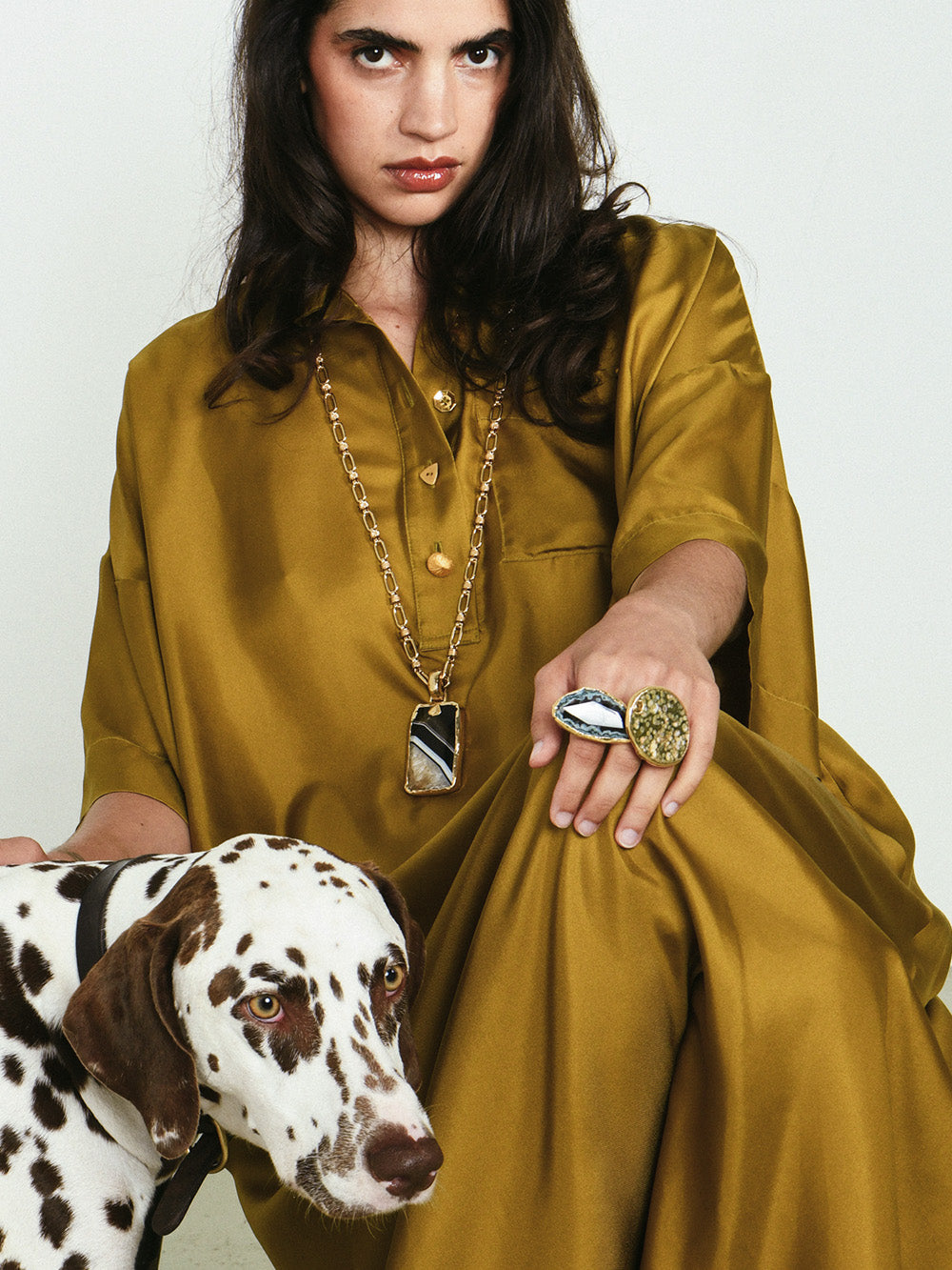 Bague Aura signée Françoise x Gas Bijoux. Un bijou doré à l'or fin et serti d'une pierre véritable Kambaba sélectionnée parmi 55 ans de création et réutilisée dans une démarche d'upcycling. Chaque pièce est unique.