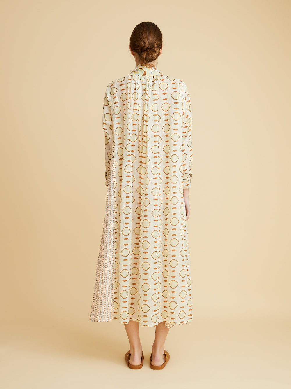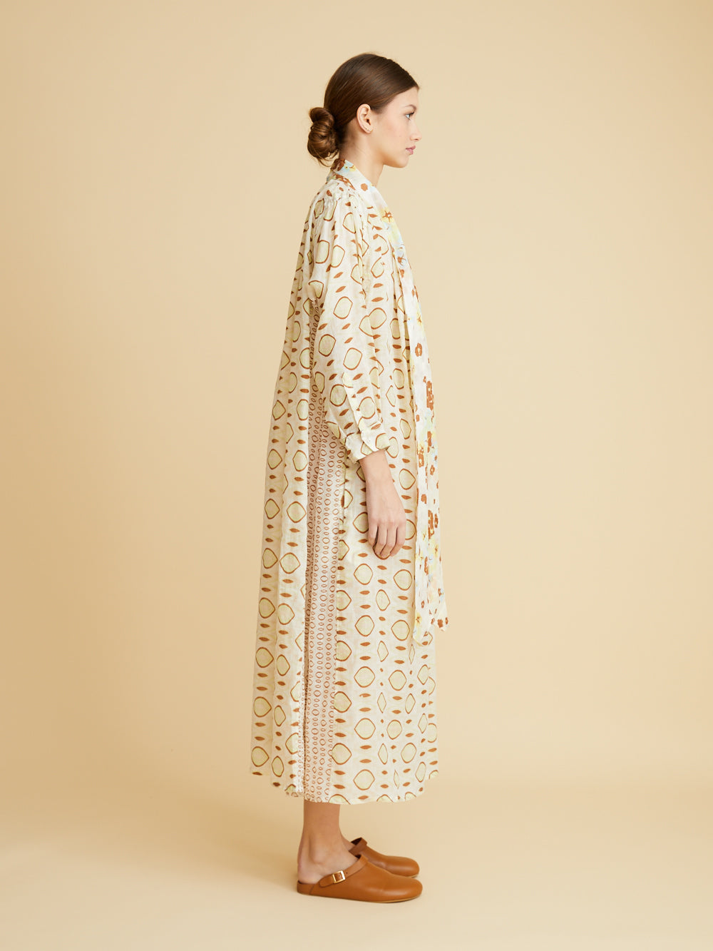 Cette robe Bow signée Yvonne S est confectionnée dans un lin léger imprimé Cream Base. À manches longues, elle a des poignets boutonnés, des fronces dans le dos, des poches latérales, un empiècement large sur le devant à nouer comme un gros noeud ou à laisser ballant. Elle propose une coupe large et ample avec une longueur aux chevilles.