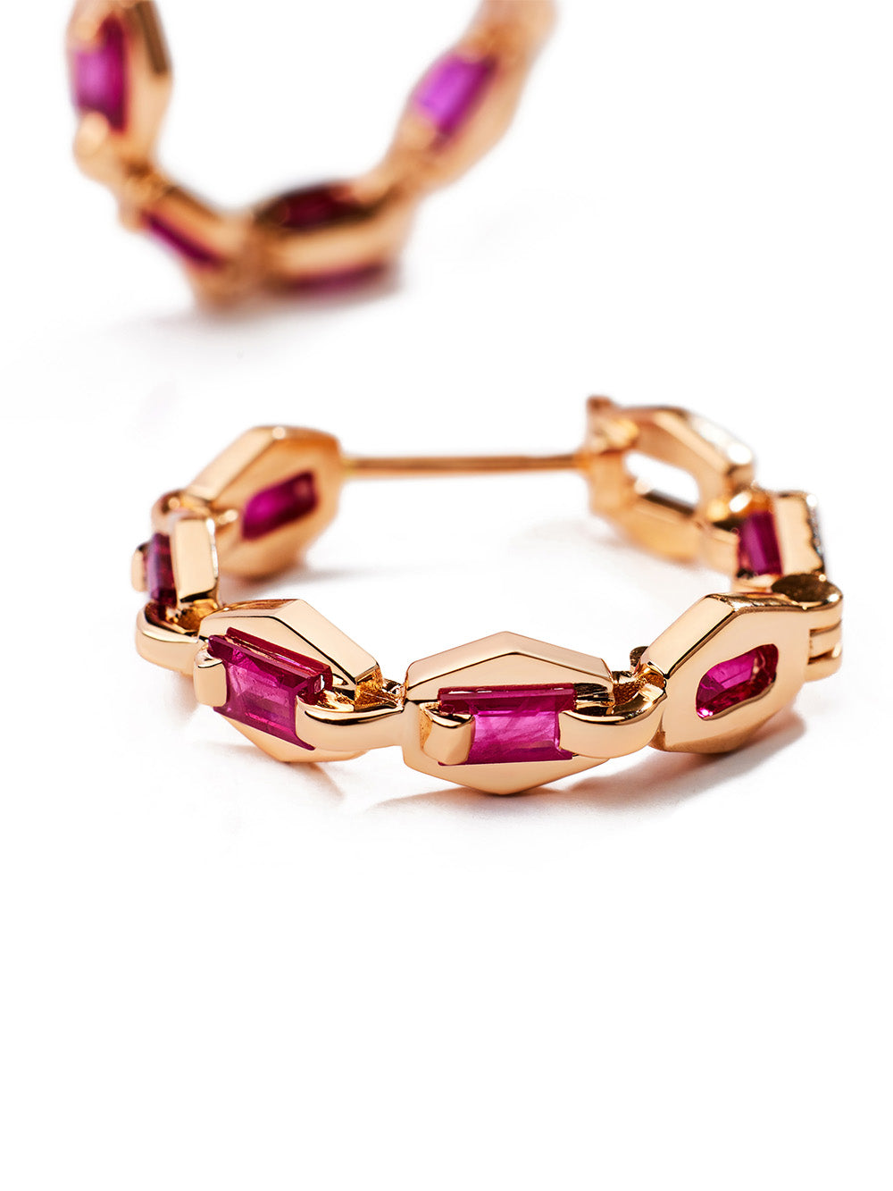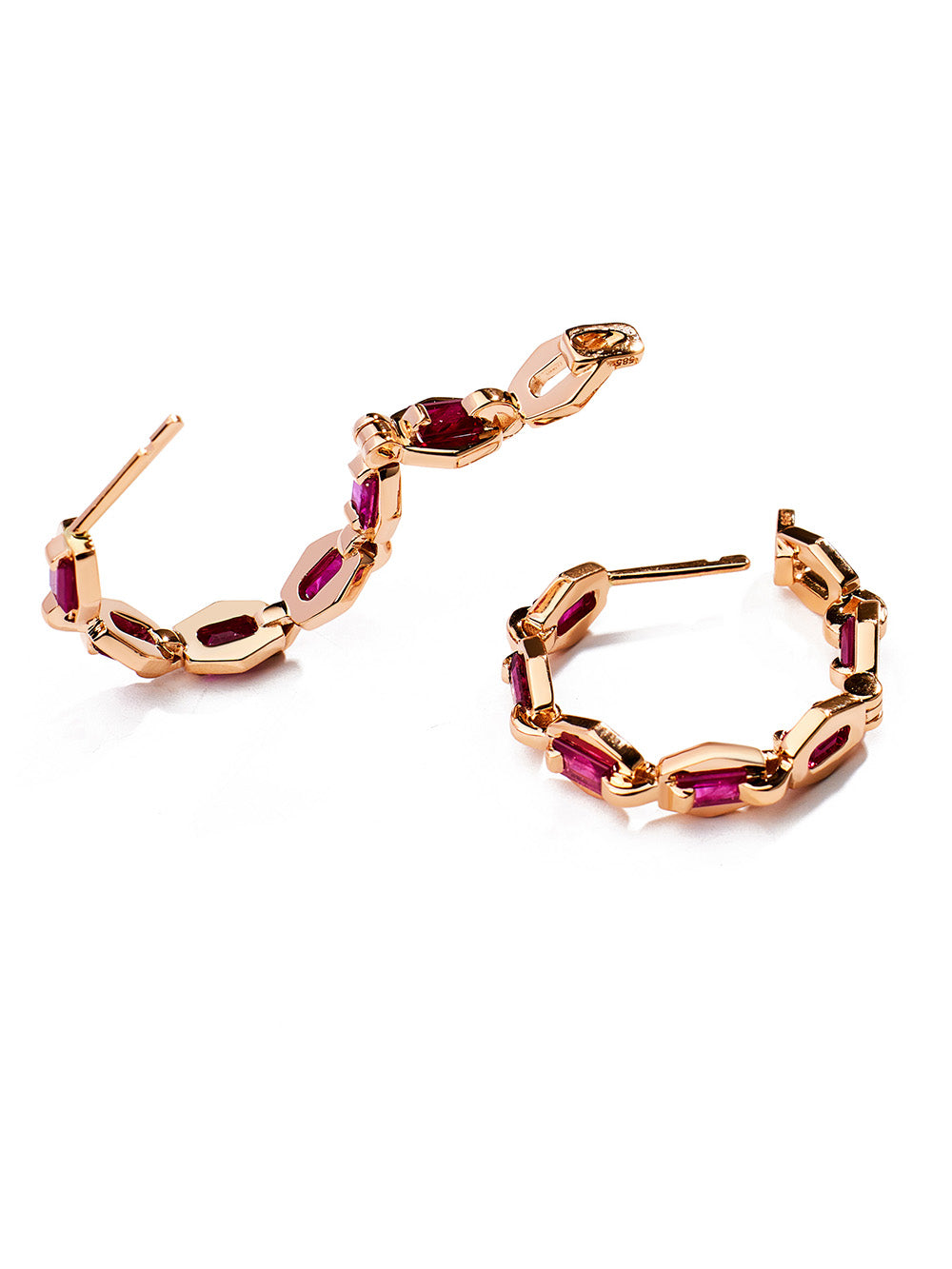 Boucles d'oreilles Love Petit Modèle signées Lito confectionnées en or rose 14 carats serti de rubis taille baguette. Un design inspiré des chaînes de bijouterie.