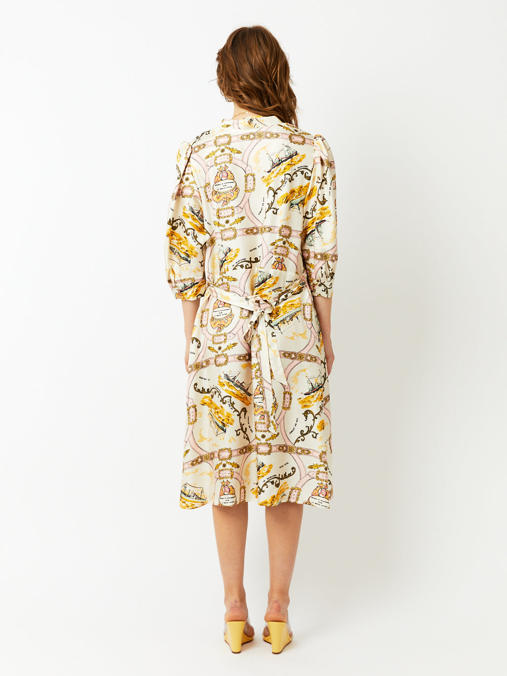 Robe Lisa Attachement Rose signée La Prestic Ouiston confectionnée en twill de soie imprimé sur le thème naval. Une robe chemise avec des manches ballon trois-quarts.