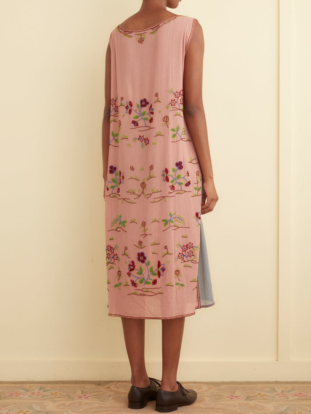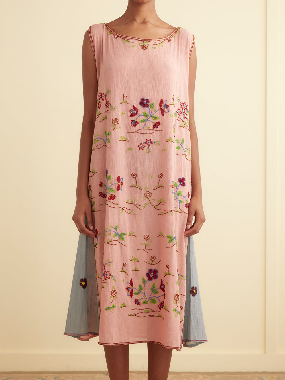 Cette robe Starflower Drake en crêpe texturé signée Bode s'inspire d'une robe des années 1920. Les stylistes ont reproduit la pièce originale, qui était perlée de motifs floraux rouges, verts et violets.