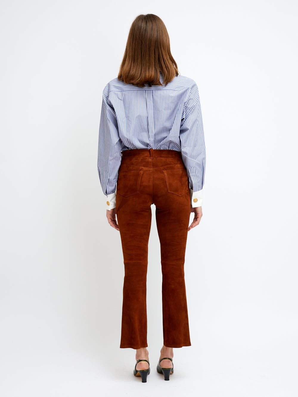 Pantalon Dean signé Stouls confectionné en cuir d'agneau velours de couleur marron foncé. Un pantalon droit à la taille mi-haute et longueur cheville.