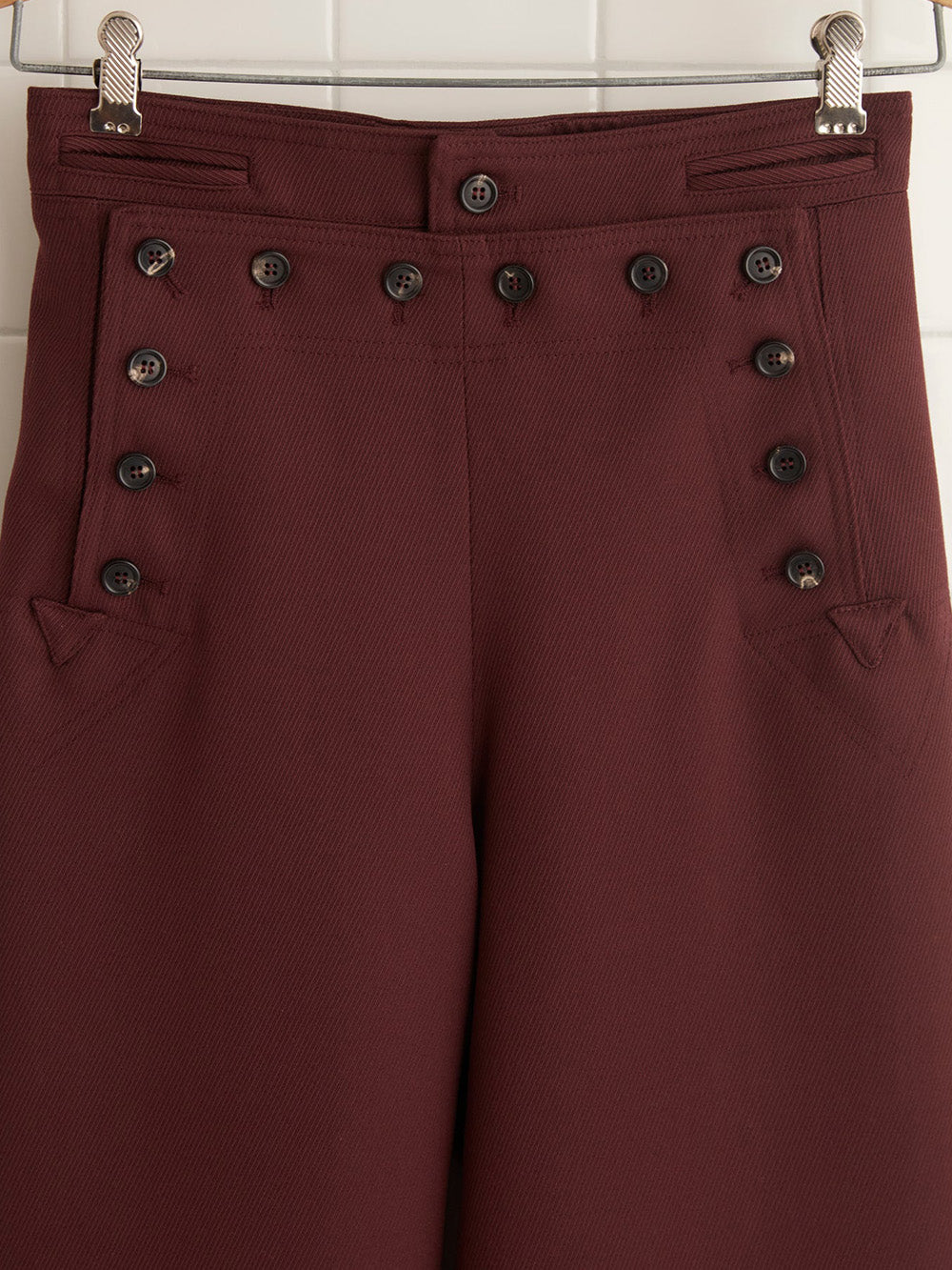 Ce pantalon Sailor signé Bode est confectionné en laine bordeaux. Sa coupe est inspirée de la marine américaine des années 1940 avec l'emblématique plastron boutonné sur le devant. Un pantalon taille haute avec les jambes évasées.