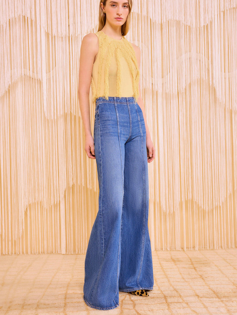 Jean The Bianca Danube signé Ulla Johnson fabriqué à la main à Los Angeles dans une toile de jean premium de couleur indigo. Une jean large à la taille haute hollywoodienne pour un style chic.
