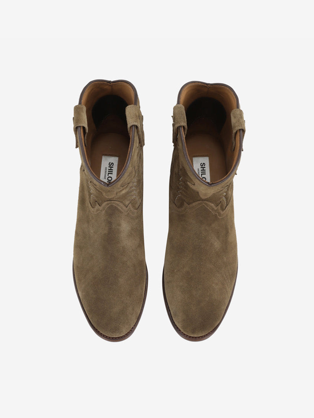Les bottines Santiag Early Midnight Chestnut en daim de la marque Shiloh Heritage sont entièrement fabriquées à la main.