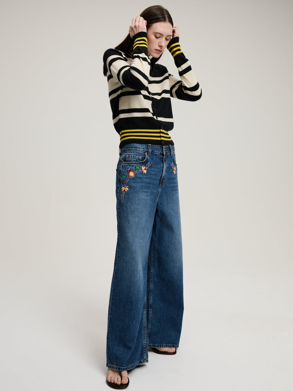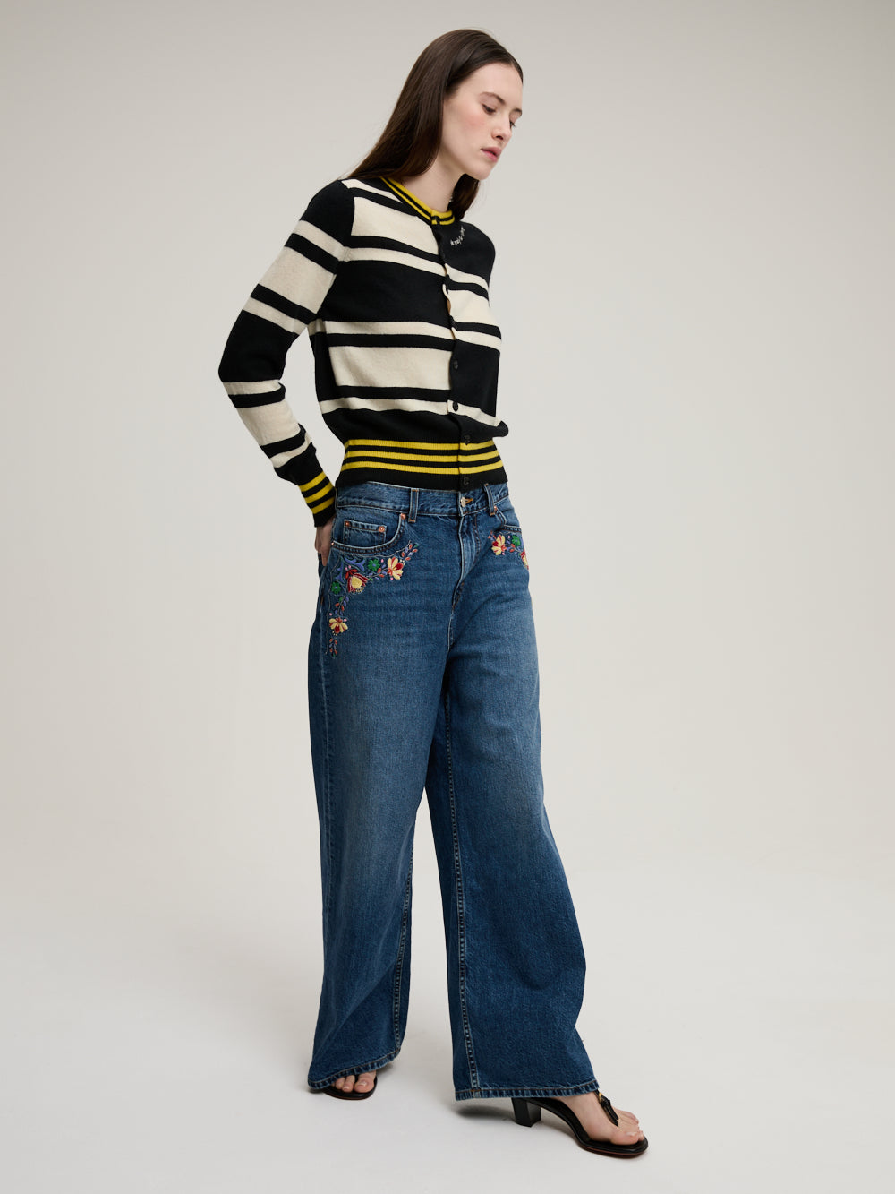 Cardigan Décalé signé Monoki confectionné en cachemire aux rayures noir et blanc décalées ainsi que des rayures jaunes. Un cardigan boutonné sur le devant au col rond brodé de l'inscription "Be ready for a change".