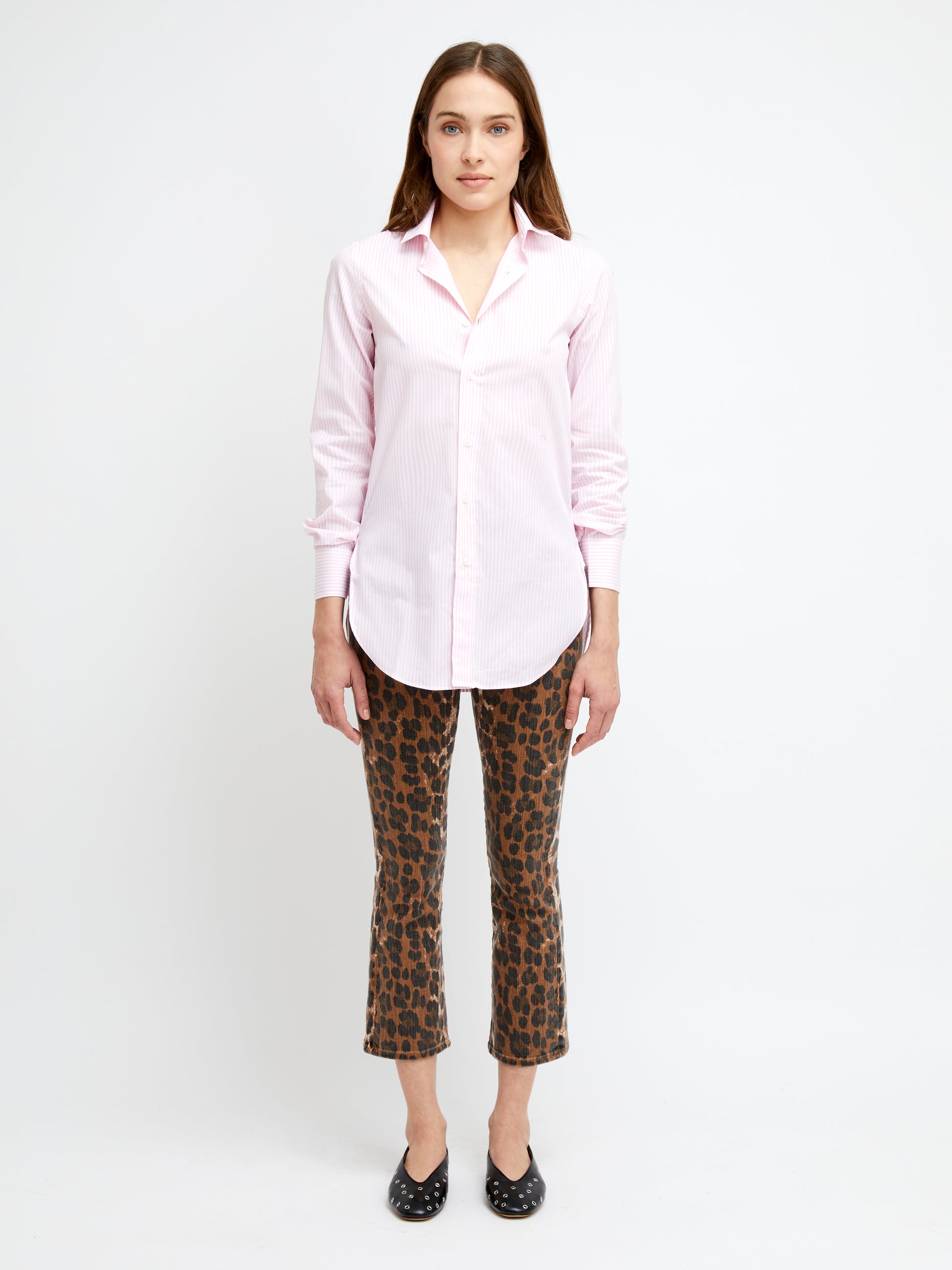 Chemise Cameron signée Faliero Sarti confectionnée en popeline de coton rose aux rayures blanches. Une chemise classique et minimaliste avec col italien et manches longues.