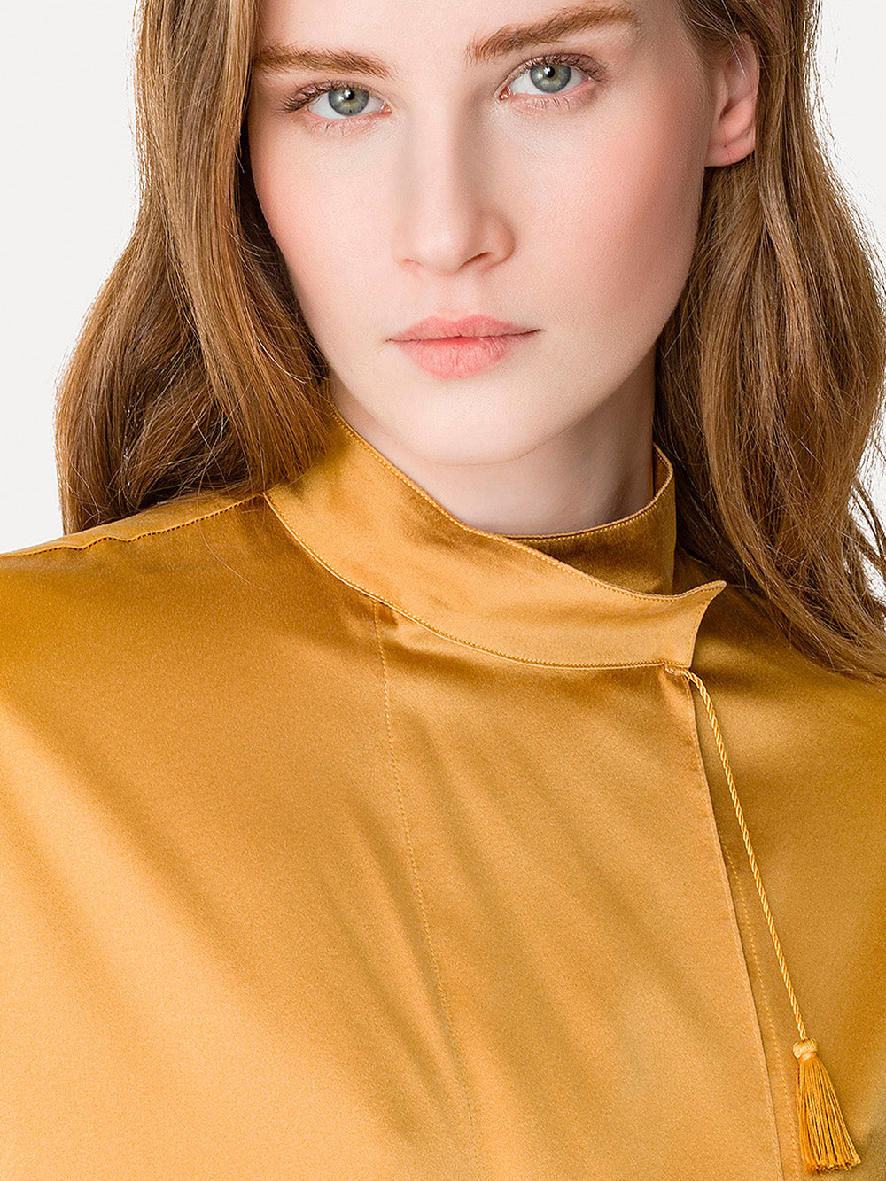 Chemise Kimono Ambra signée Forte_Forte confectionnée en satin de soie à la couleur ambrée. Une blouse manches longues et col montant se fermant sur le coté avec un noeud décoré de pampilles.