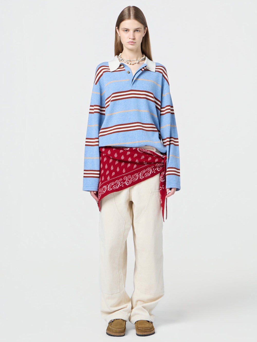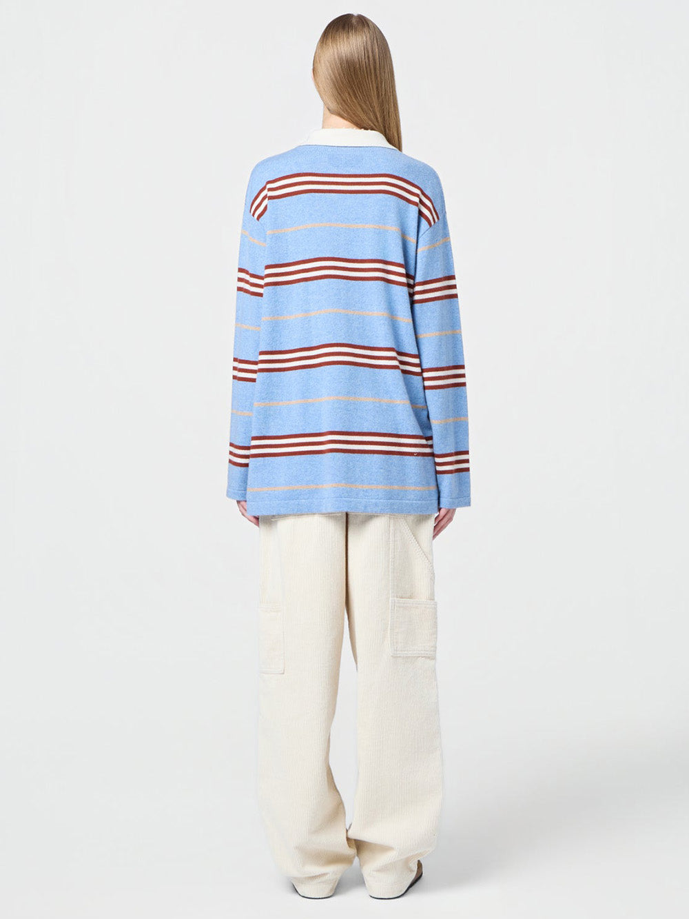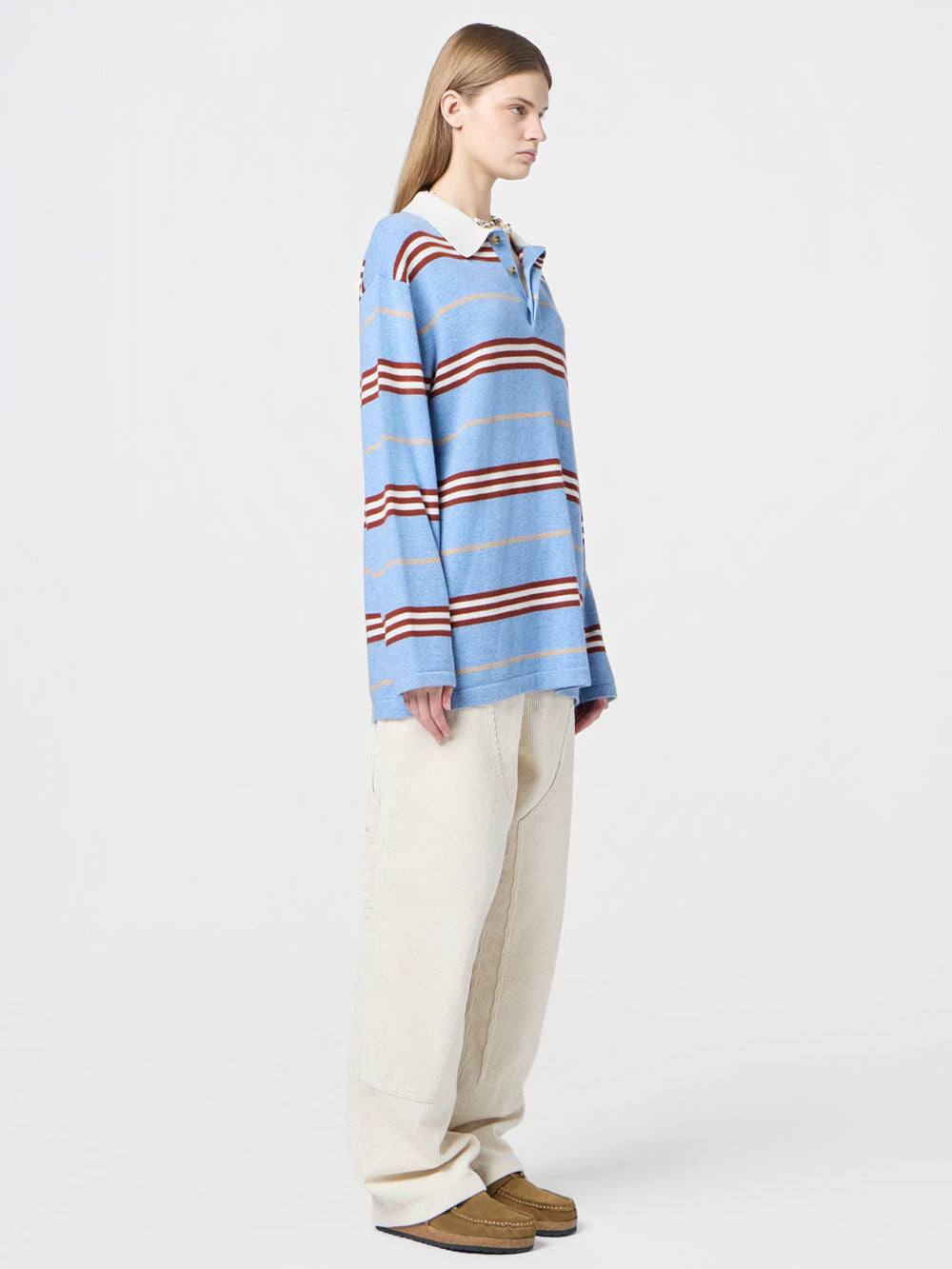 Pull Striped Rugby signé Guest In Residence confectionné en cachemire bleu ciel aux rayures bordeaux, beige et blanc. Une coupe inspiré du polo, boutonné au niveau du col.