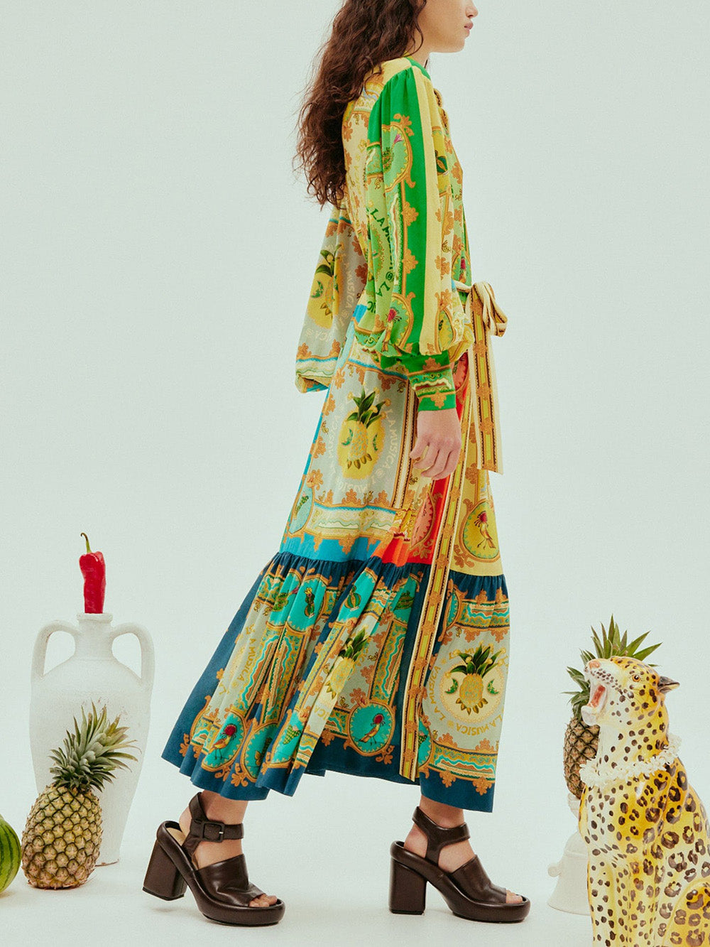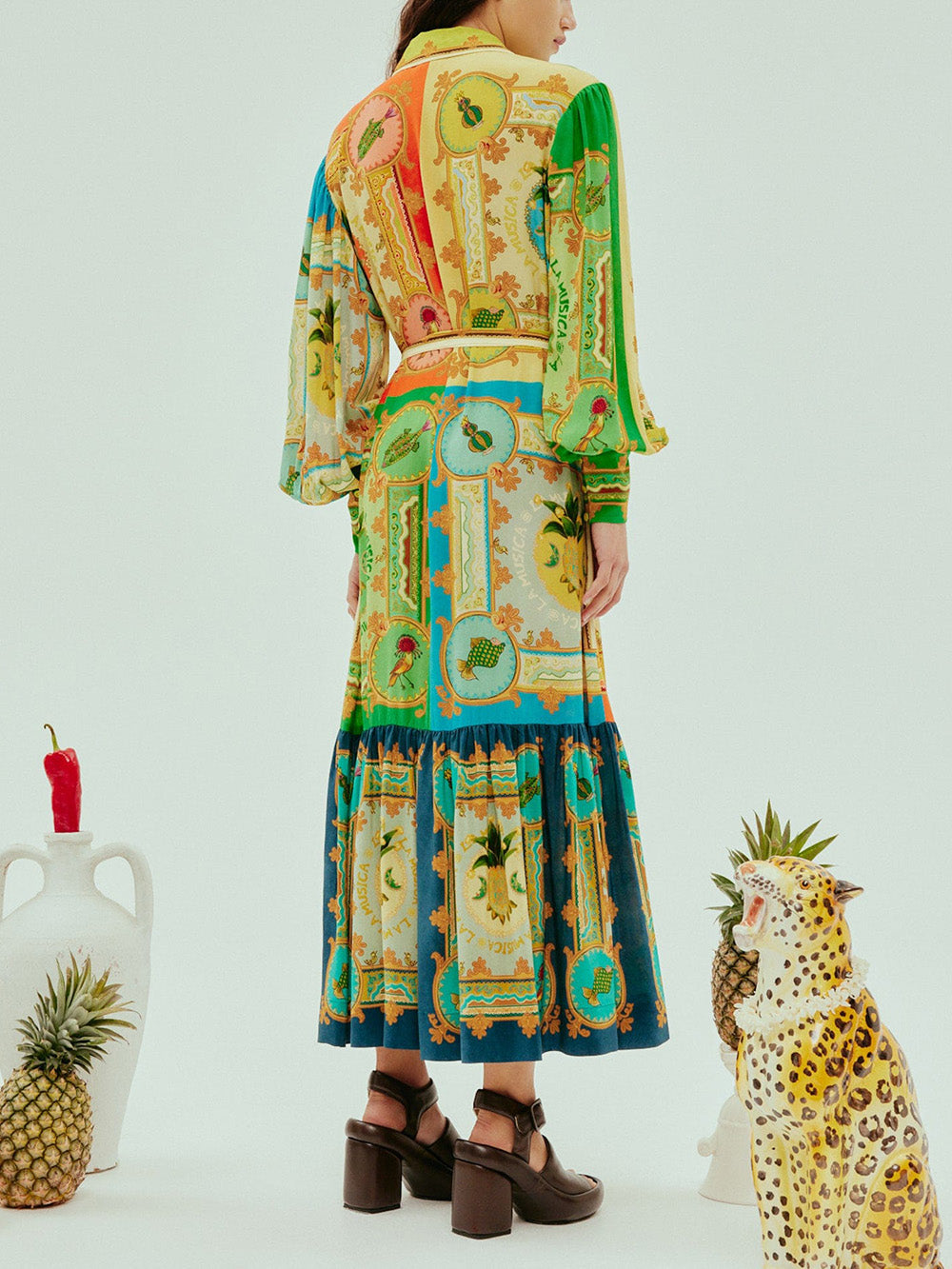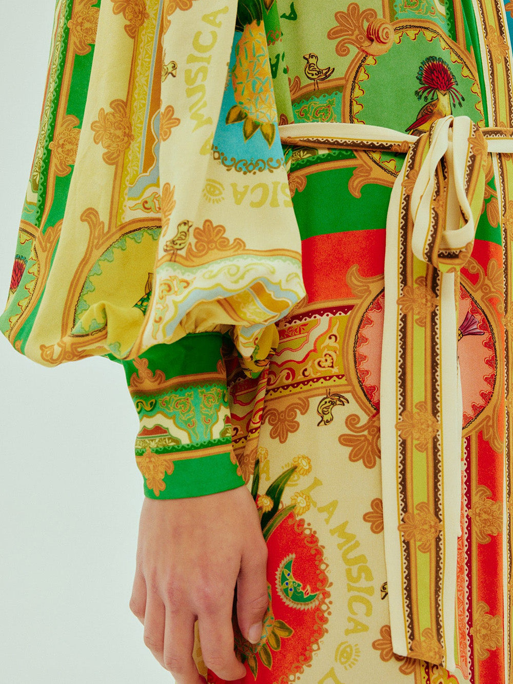 Robe Chemise La Musica signée Alémais confectionnée en soie imprimée de motifs inspirés de l'architecture et de la culture mexicaine. Une robe longue aux manches bouffantes, boutonnée sur toute la longueur.