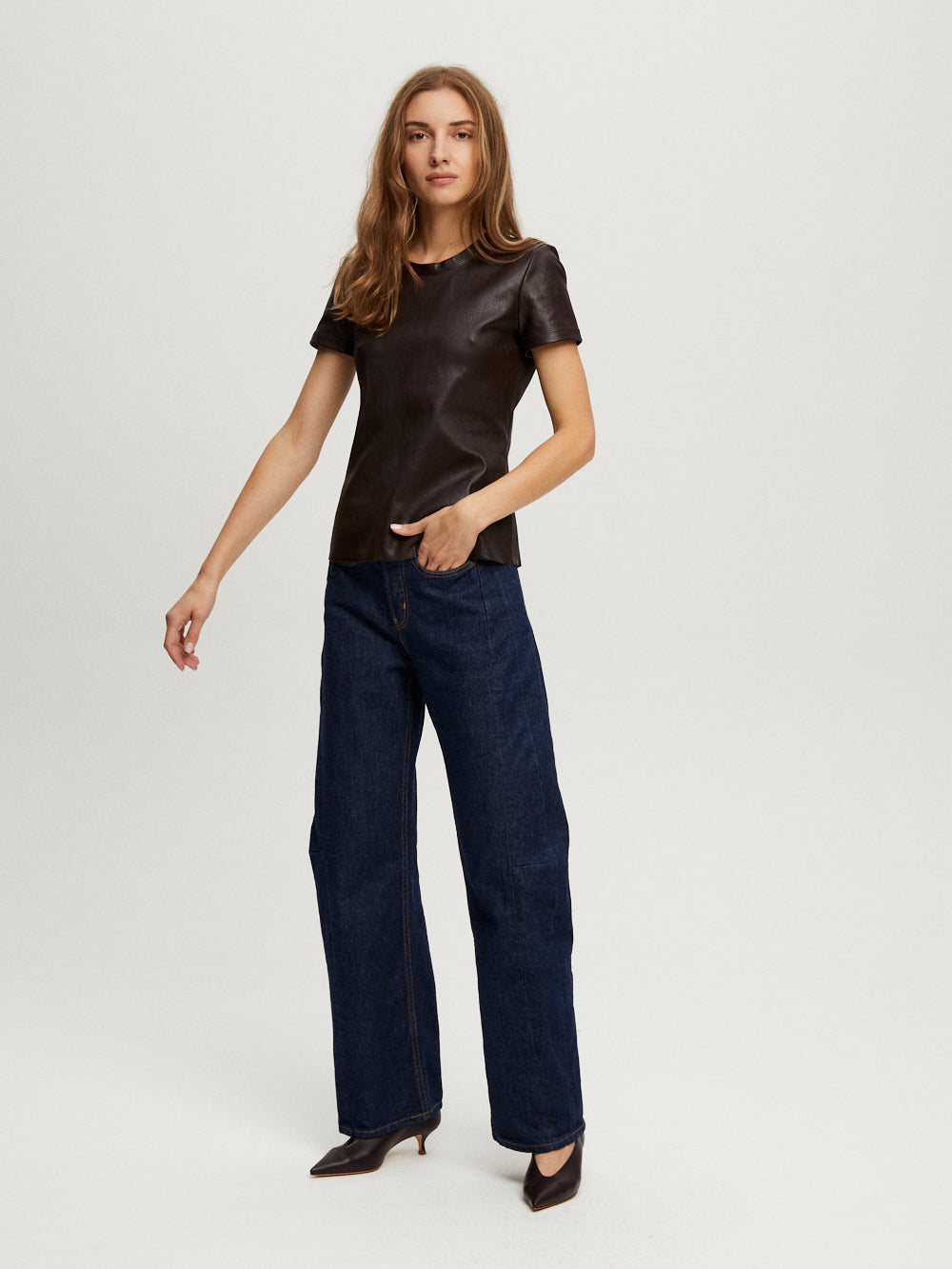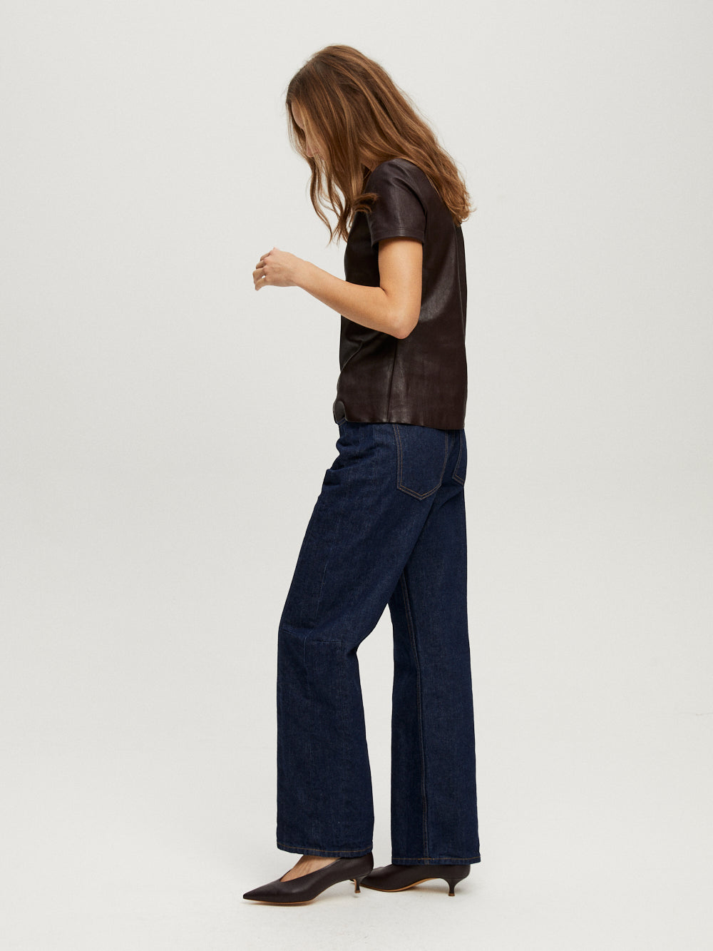 Top Stouls 05 signé Stouls confectionné en agneau plongé de couleur marron foncé. Une coupe T-Shirt ajustée et à col rond.