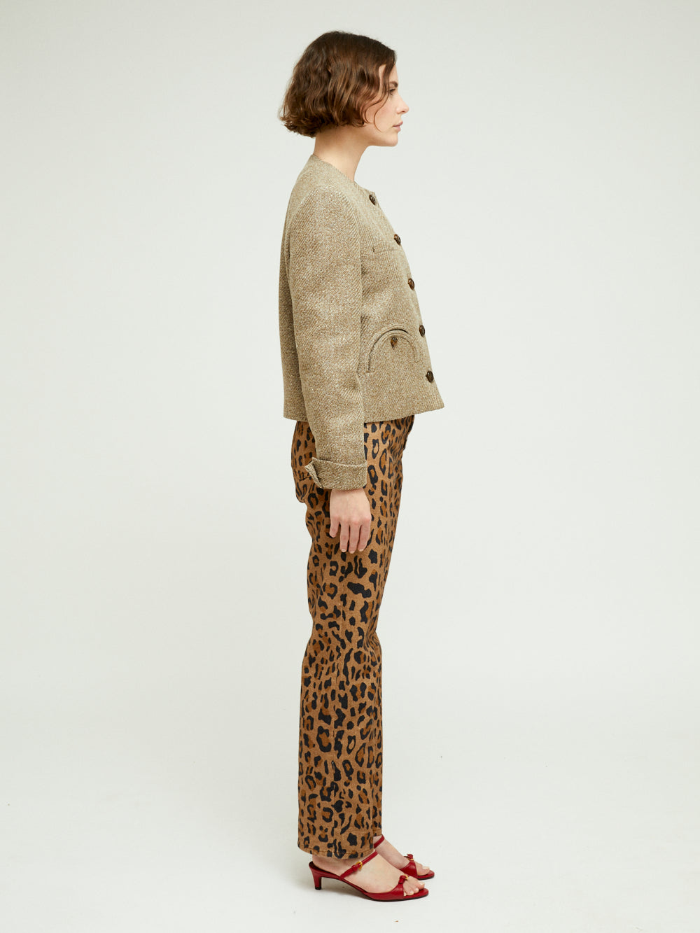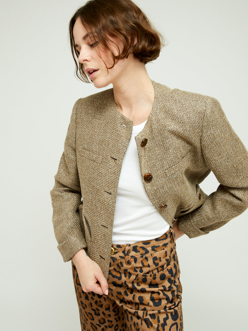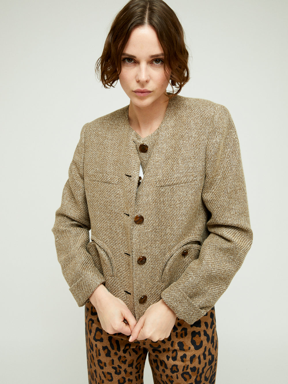 Veste Boléro Saratoga Shamo signé Blazé Milano confectionné dans un mélange de lin, coton et soie beige. Une veste courte à la coupe droite.