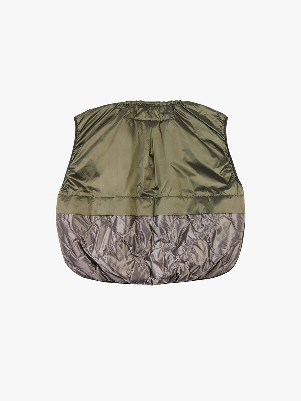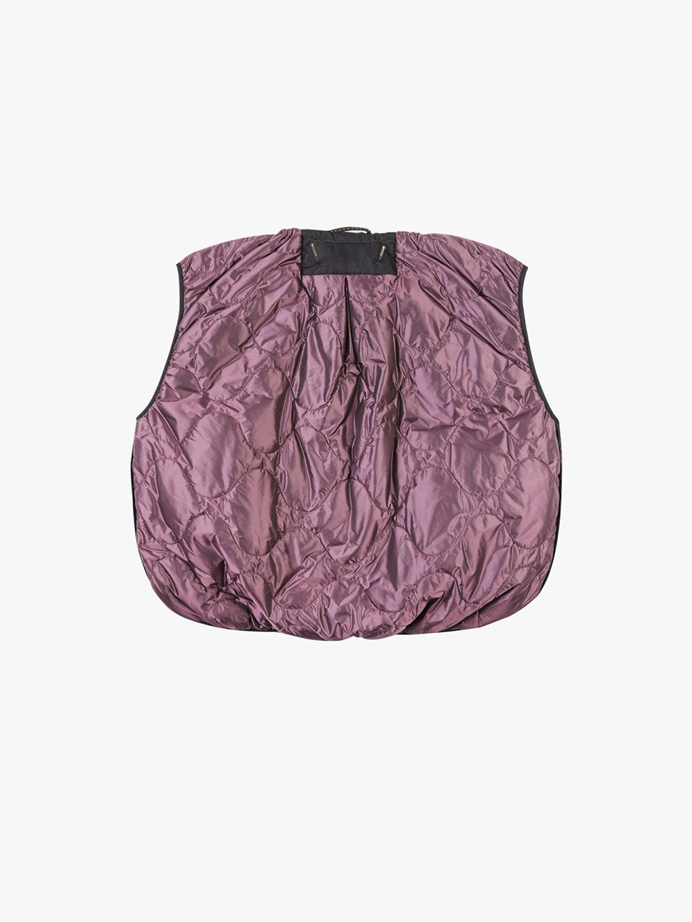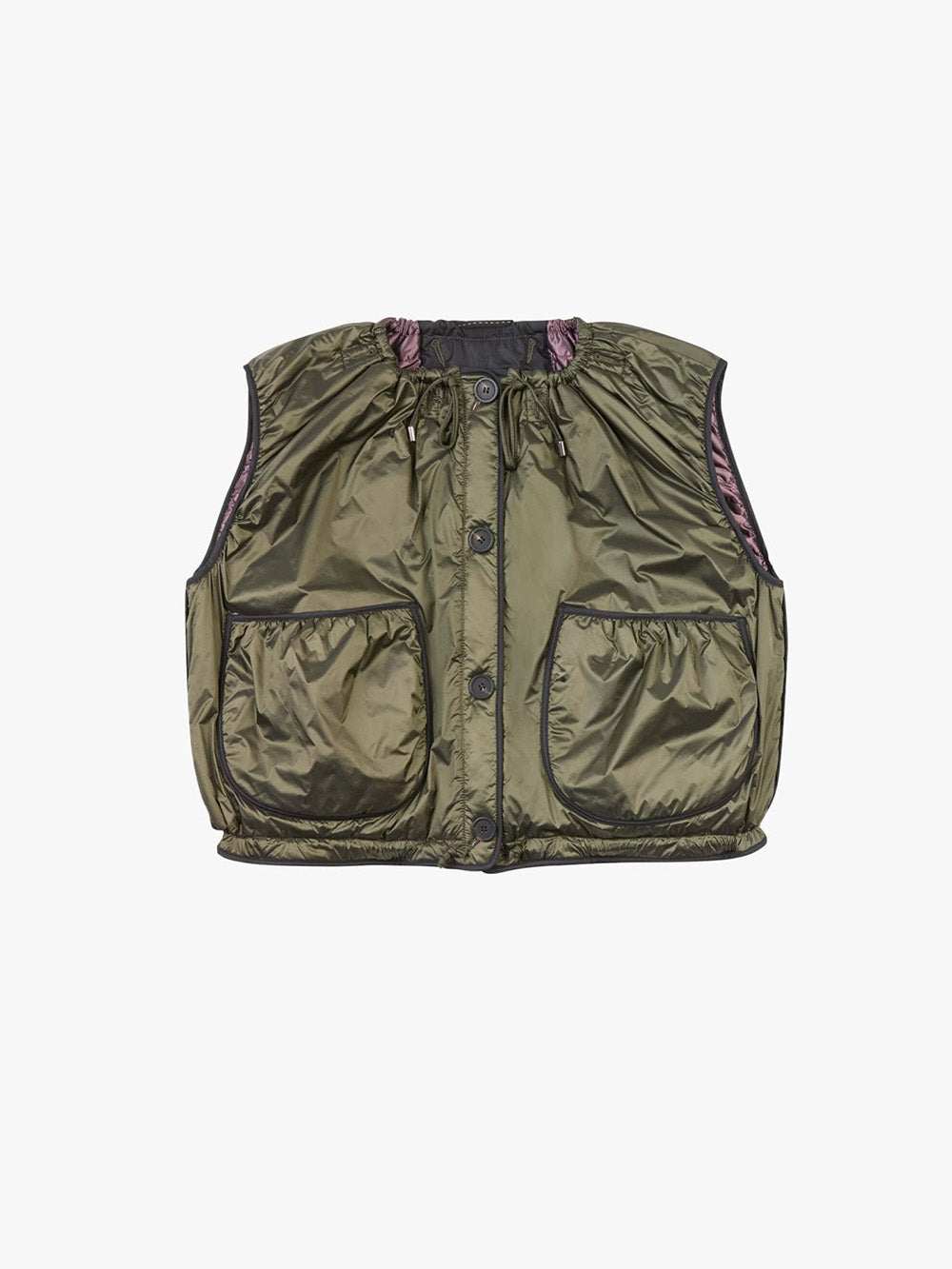 Veste Parachute signée Marfa Stance confectionnée en nylon imperméable olive et violet. Une veste sans manche légère, complètement réversible.