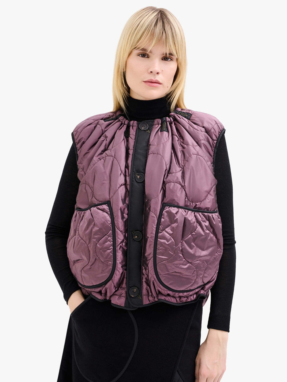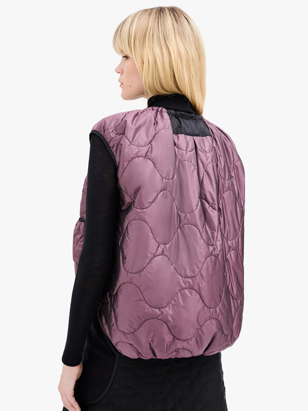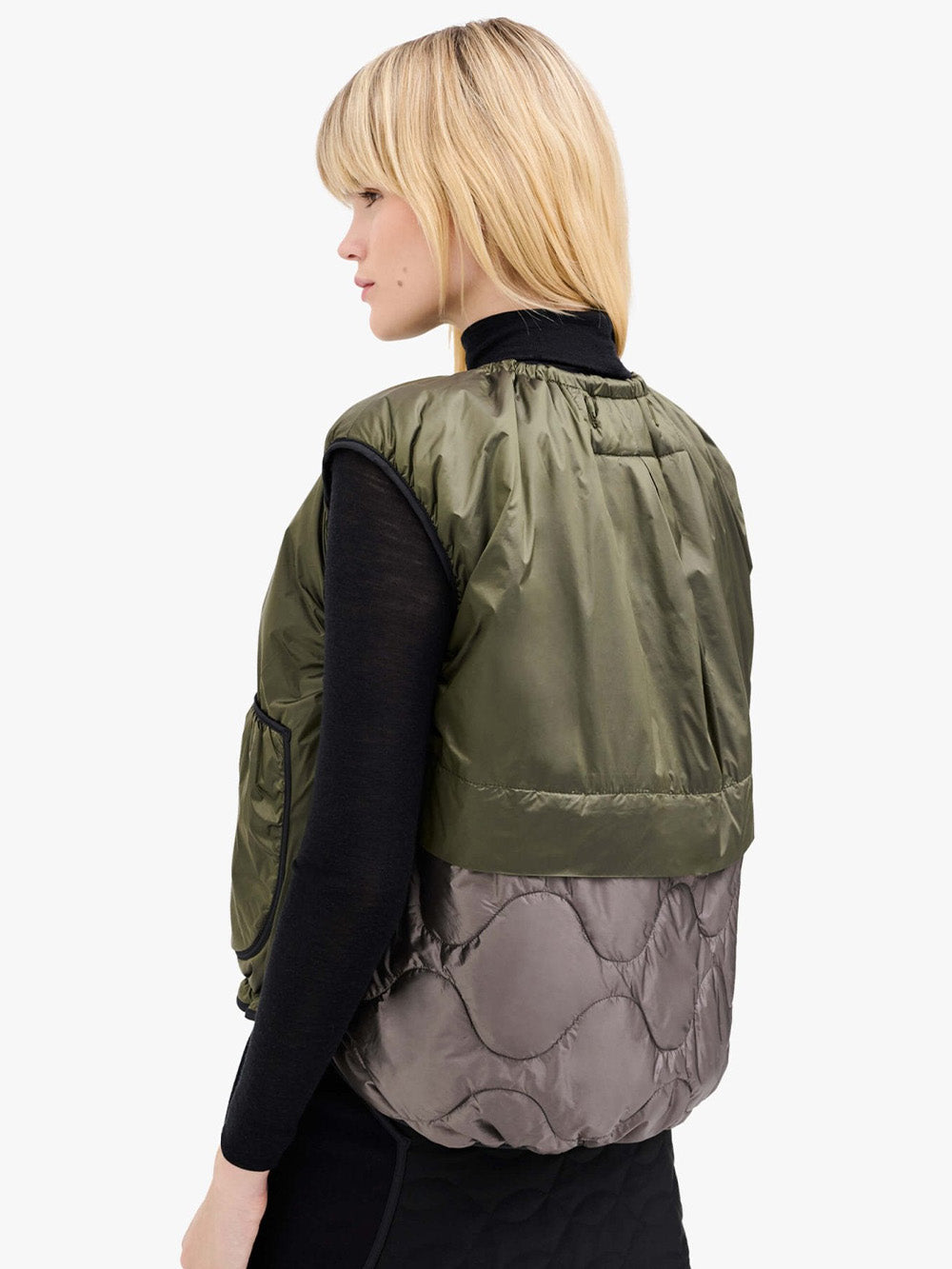 Veste Parachute signée Marfa Stance confectionnée en nylon imperméable olive et violet. Une veste sans manche légère, complètement réversible.