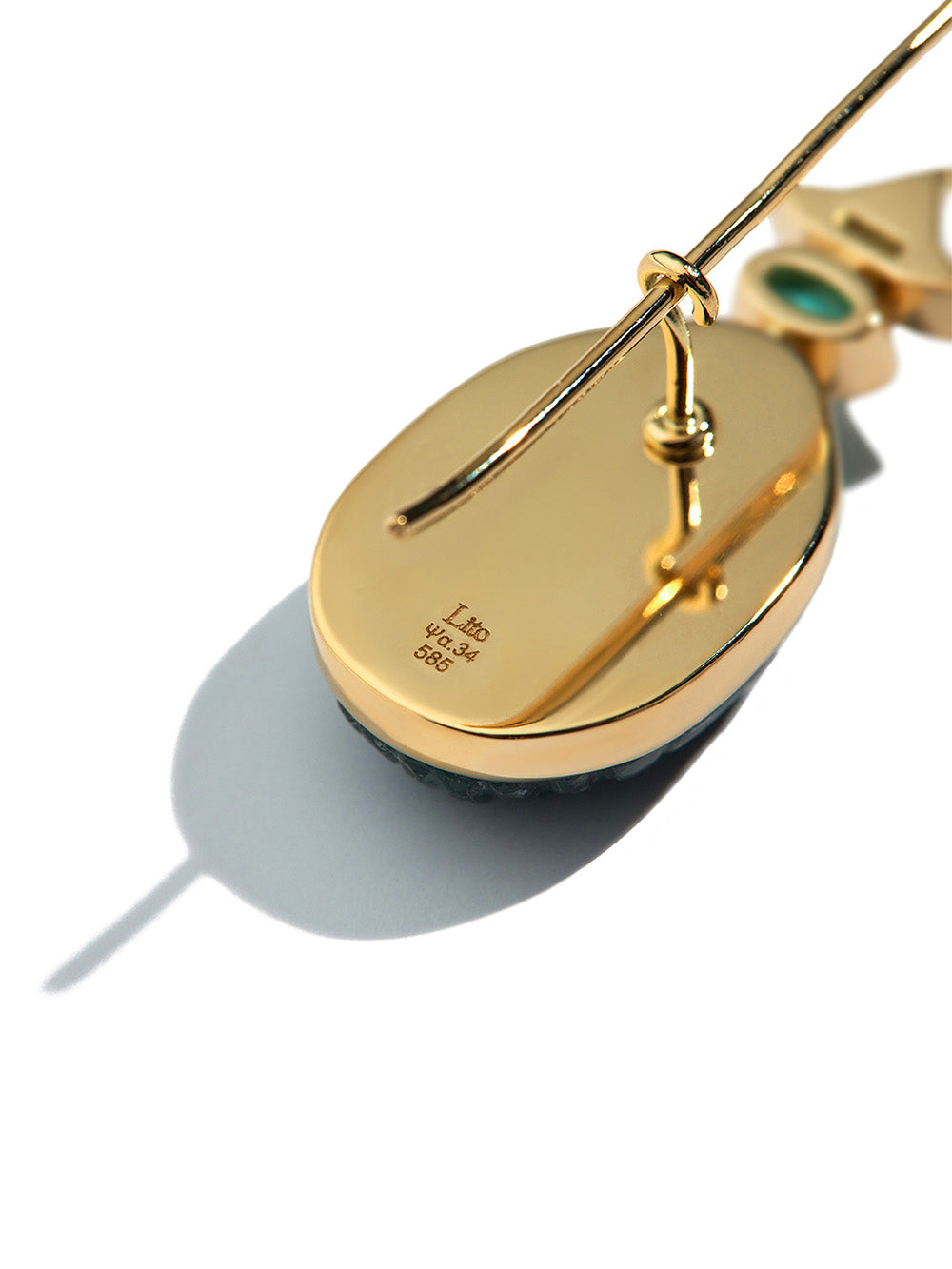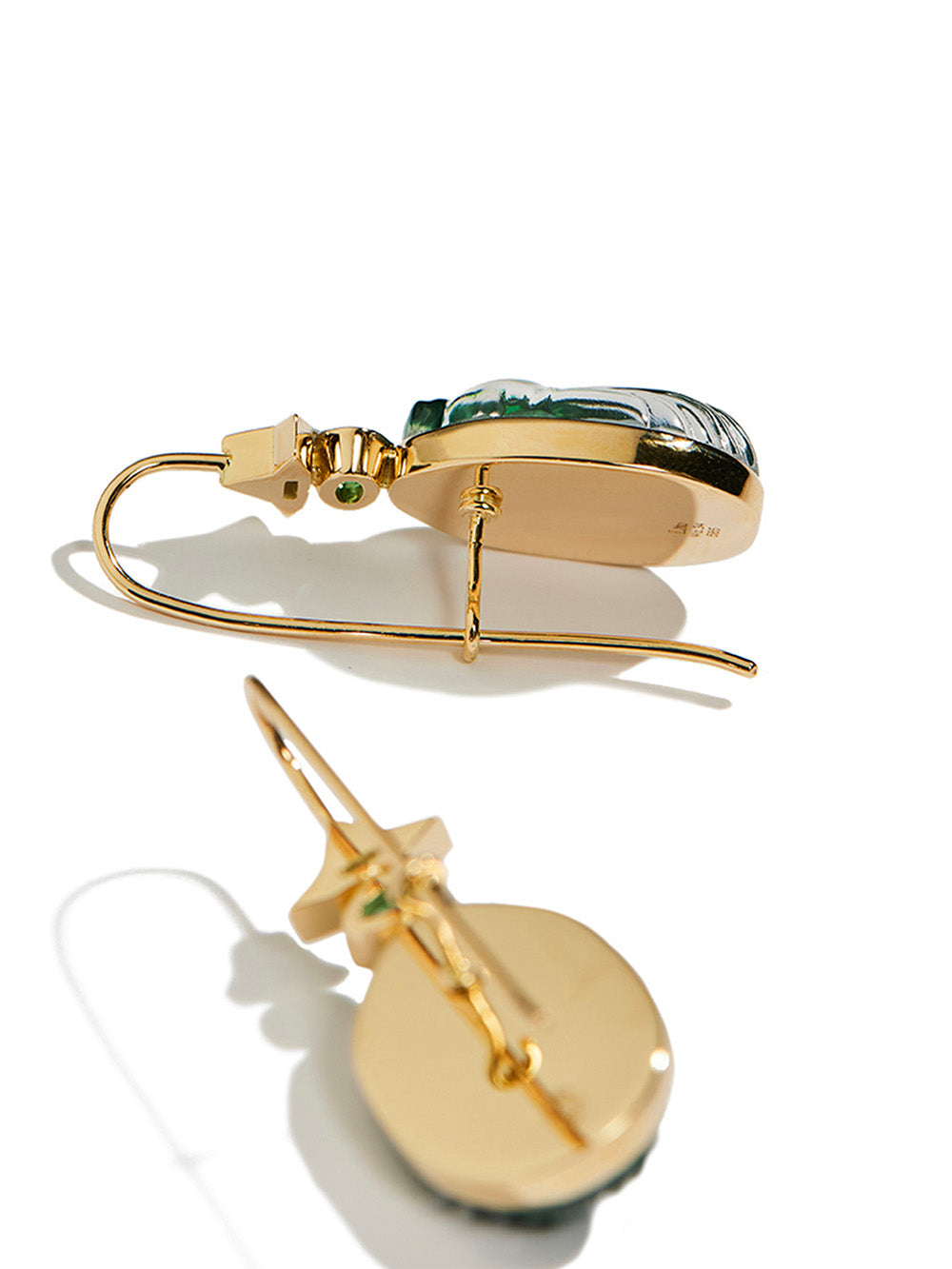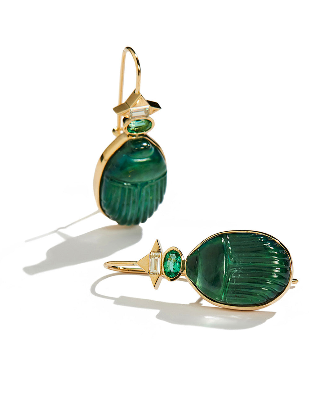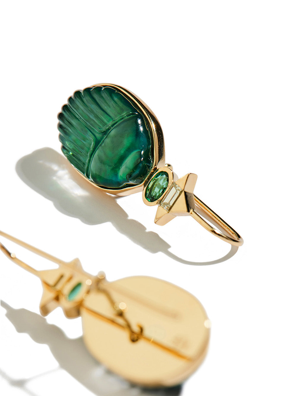 Boucles d'oreilles Alessia signées Lito confectionnées en calcédoine taillée en forme de scarabée le tout monté sur de l'or jaune 14 carats. Décorées d'émeraudes taille ovale et de diamants taille baguette.