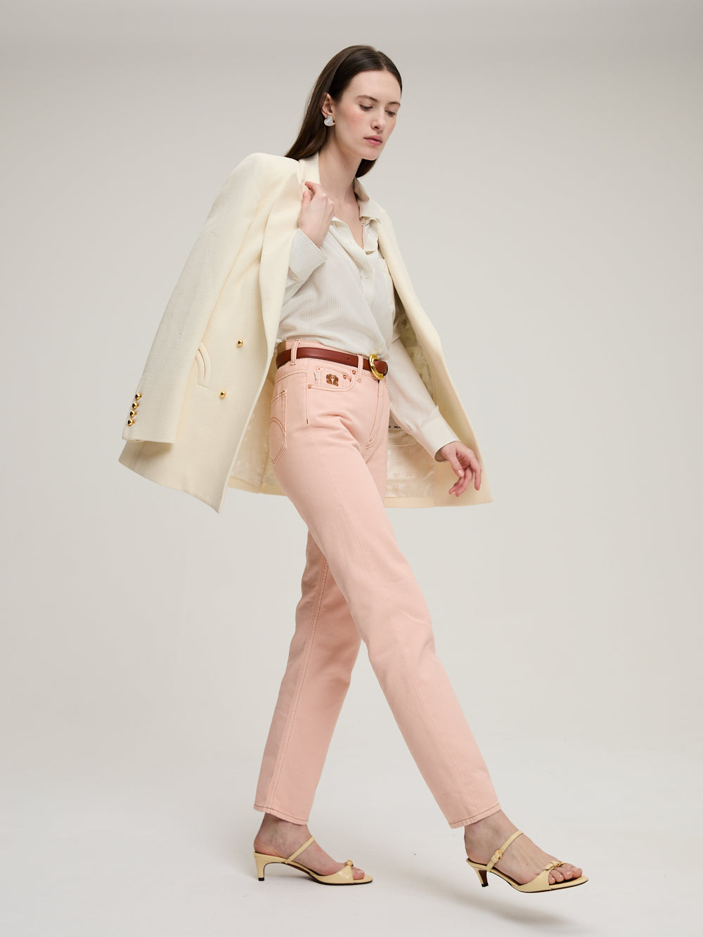Jean Paso Clapotis signé Blazé Milano confectionné en toile de jean rose poudré. Un jean coupe droite et taille haute. Un classique de la garde-robe.