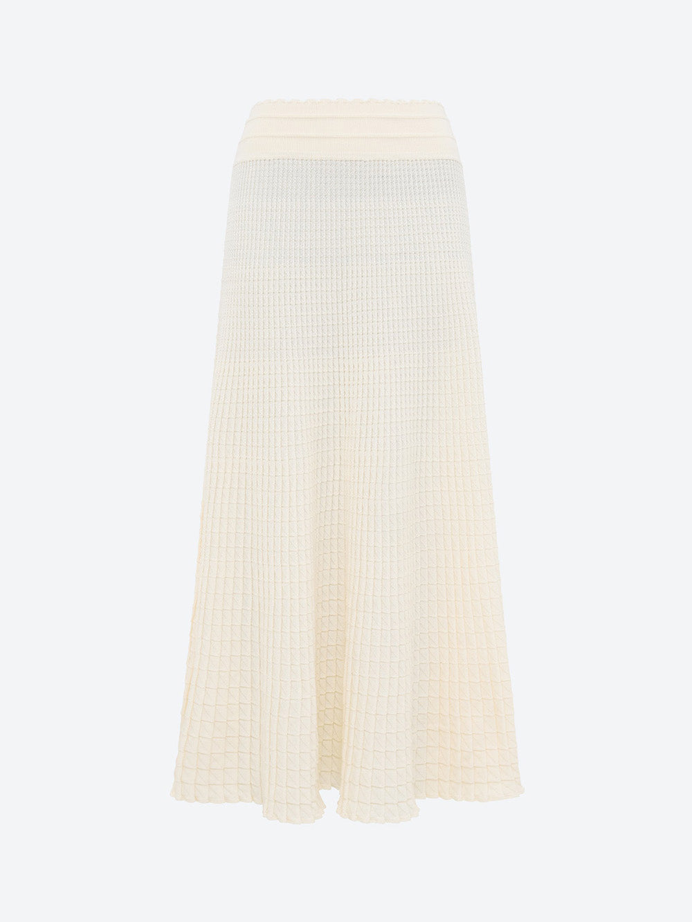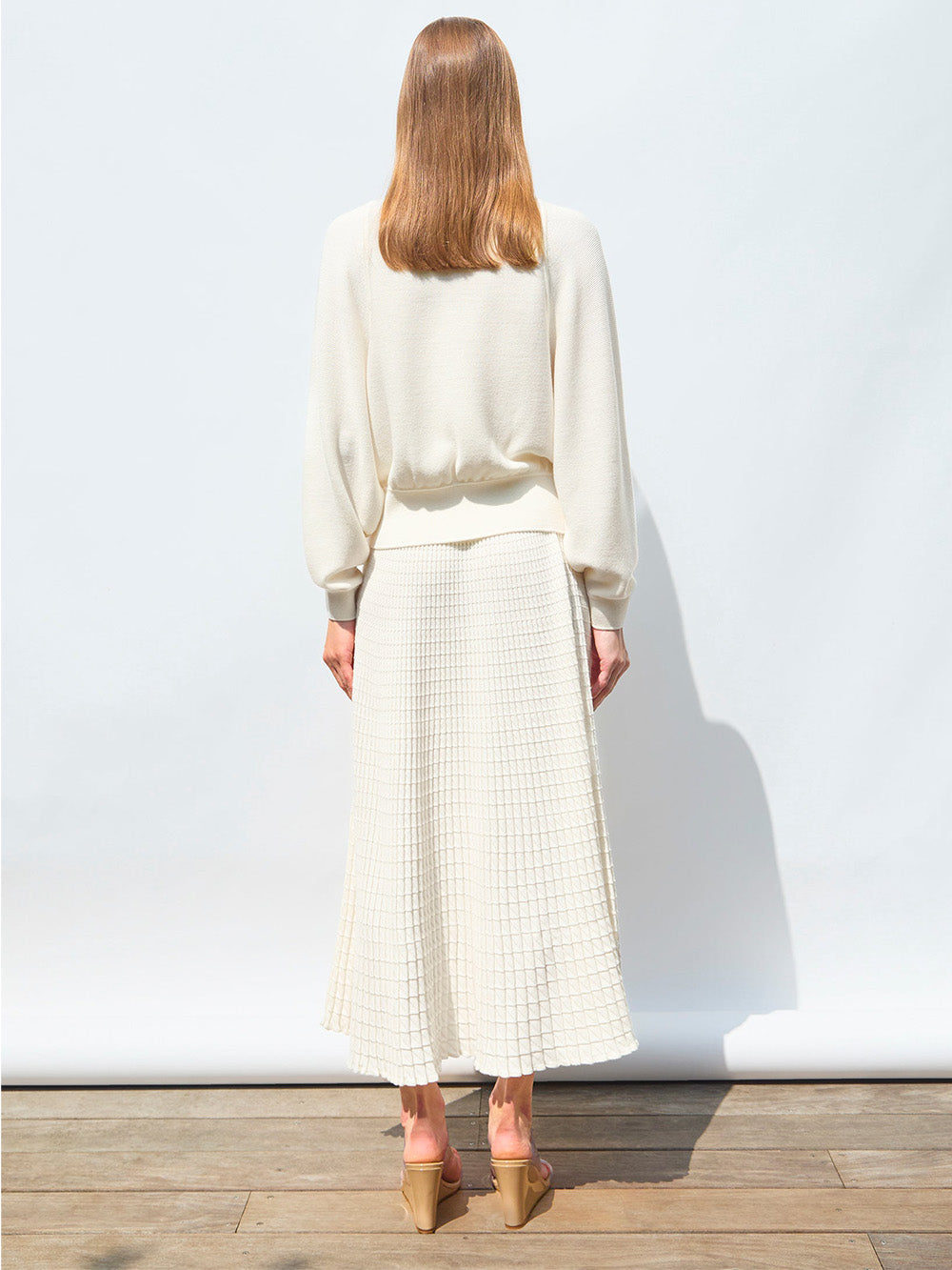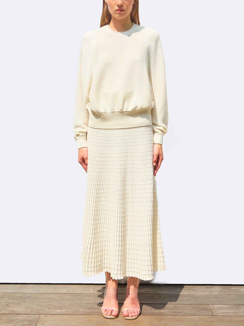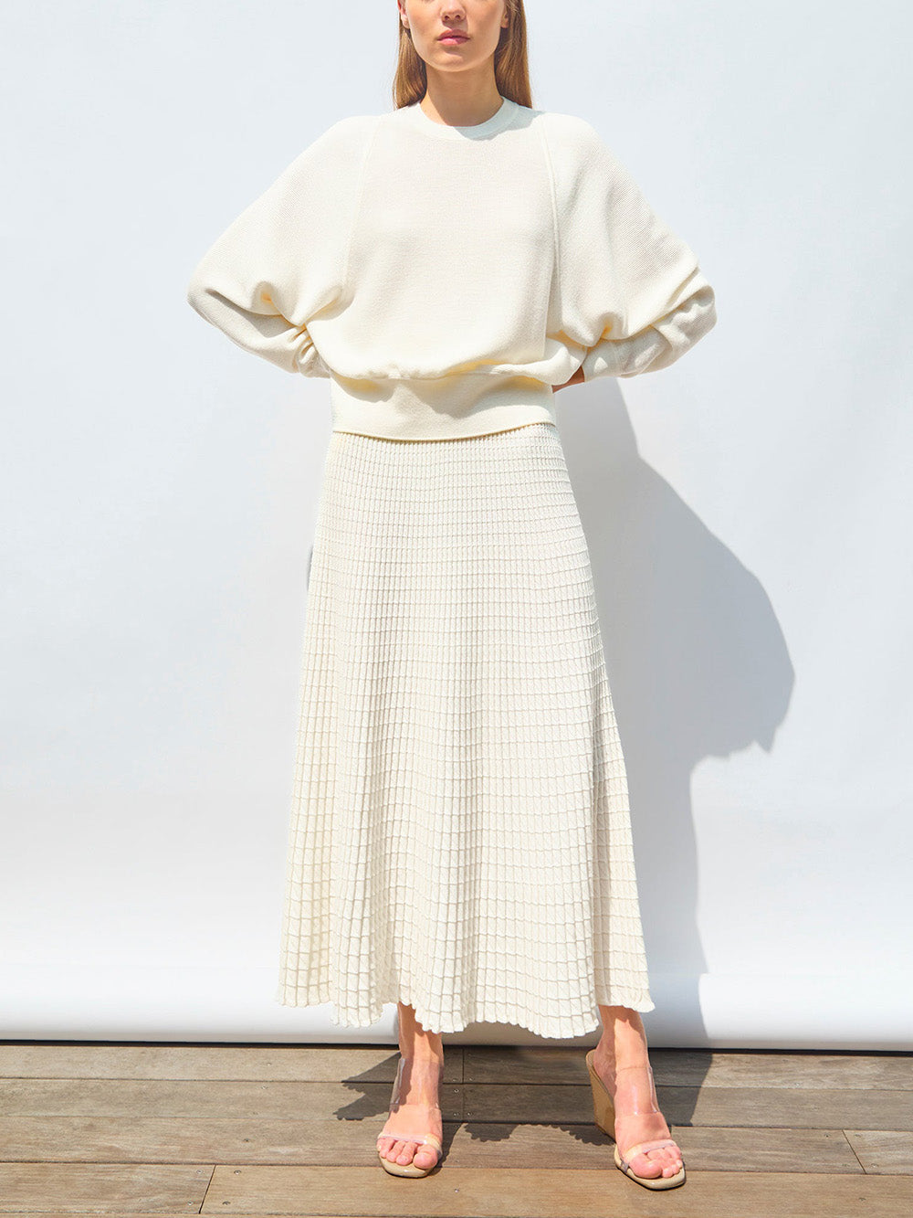 Jupe Cocktail Origami Natural signée Molli tricotée en France dans une laine vierge extra-fine de couleur blanc cassé. Une jupe longueur midi, évasée, à la taille signature festonnée.