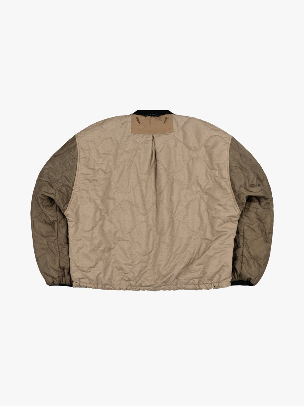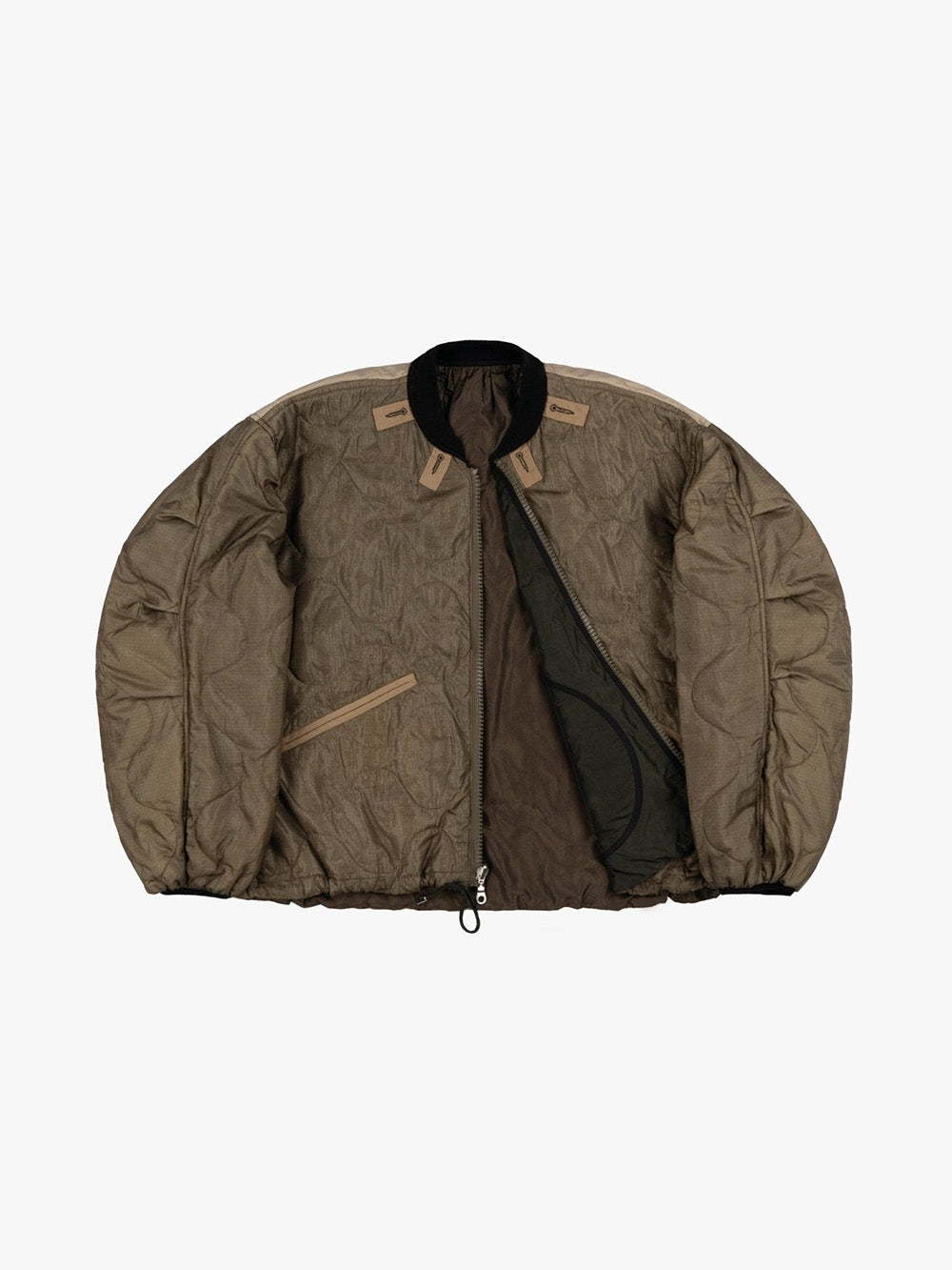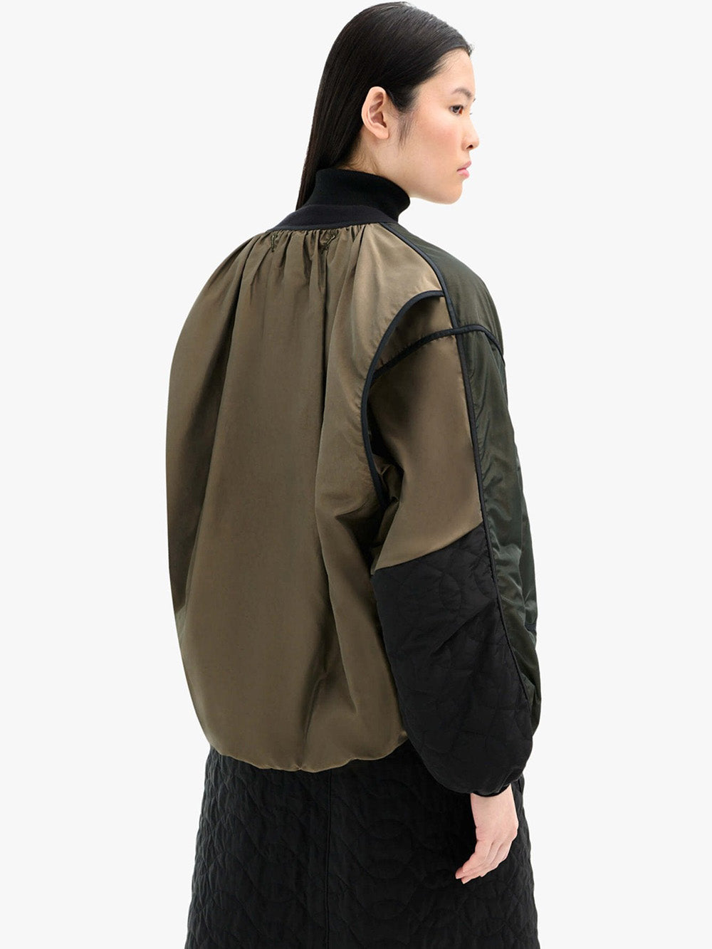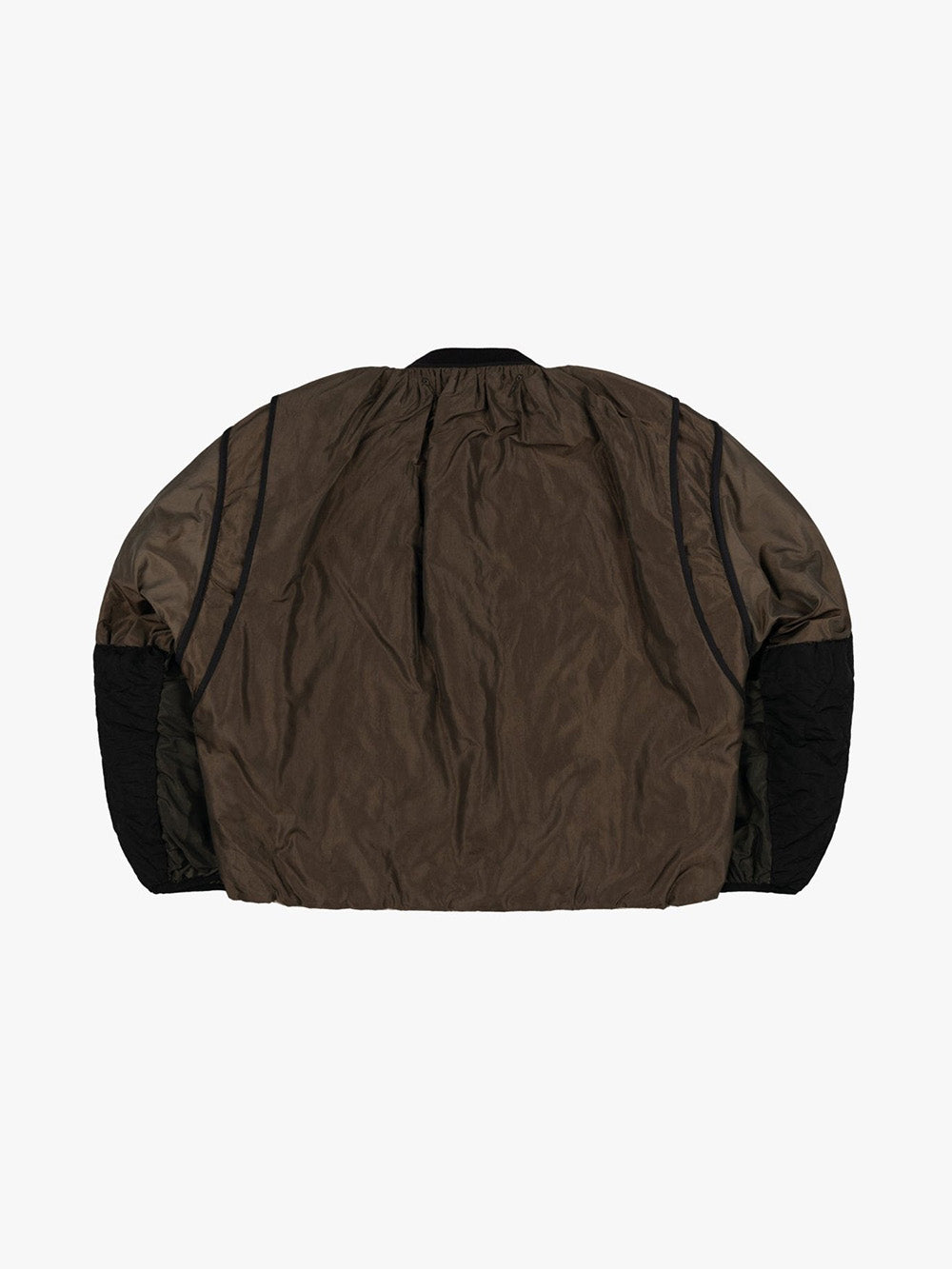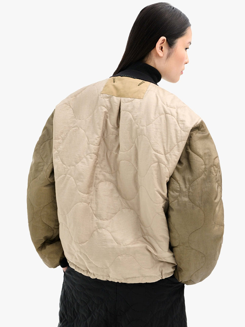 Bomber Flight signé Marfa Stance confectionné en nylon italien dans les tons kaki, beige et marron. Une veste complètement réversible oversized et aux manches bouffantes pour un effet bombé.