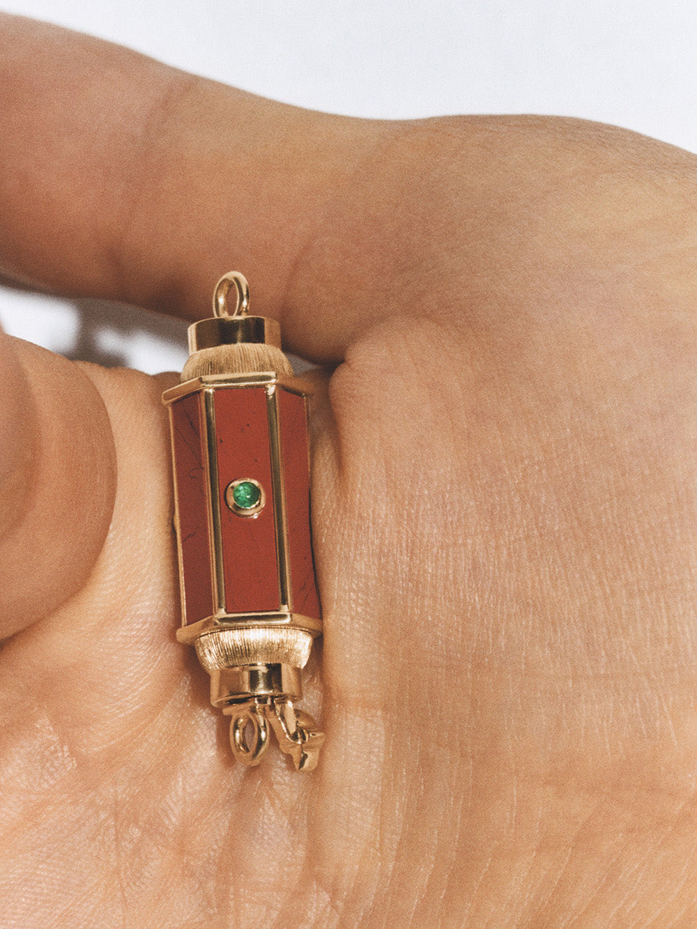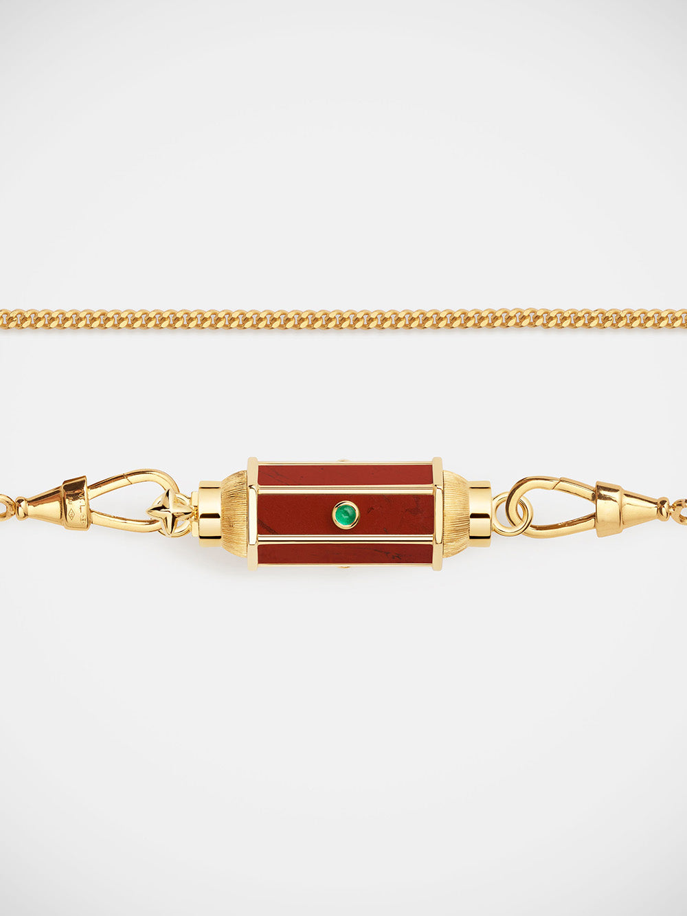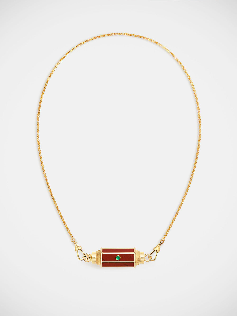 Baby Locket signé Marie Lichtenberg confectionné en or jaune 18 carats brossé sur les côtés. Un pendentif en jaspe rouge sertie d'émeraudes taille cabochon. - Émeraudes : 0.11 carat - Jaspe : 0.93 carat - Dimension du pendentif : 2,8cm x 1cm - Chaque pierre est unique ainsi, les détails sur la jaspe rouge peuvent varier d'une pièce à une autre. - Pièce garantie 2 ans à compter de la date d’achat sur présentation de la facture - Envoyé dans un écrin de joaillerie avec certificat d'authenticité