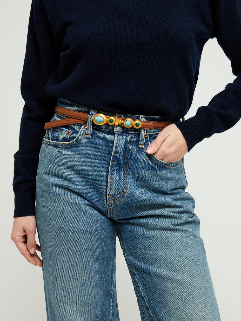 La ceinture Earth Narrow signée Sonia Petroff est réalisée à la main à partir d'un luxueux cuir italien couleur marron. Des pierres couleur turquoise et malachite serties de bordures dorées ornent le devant de la ceinture.