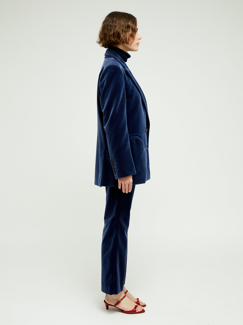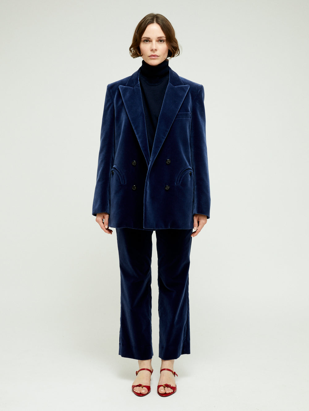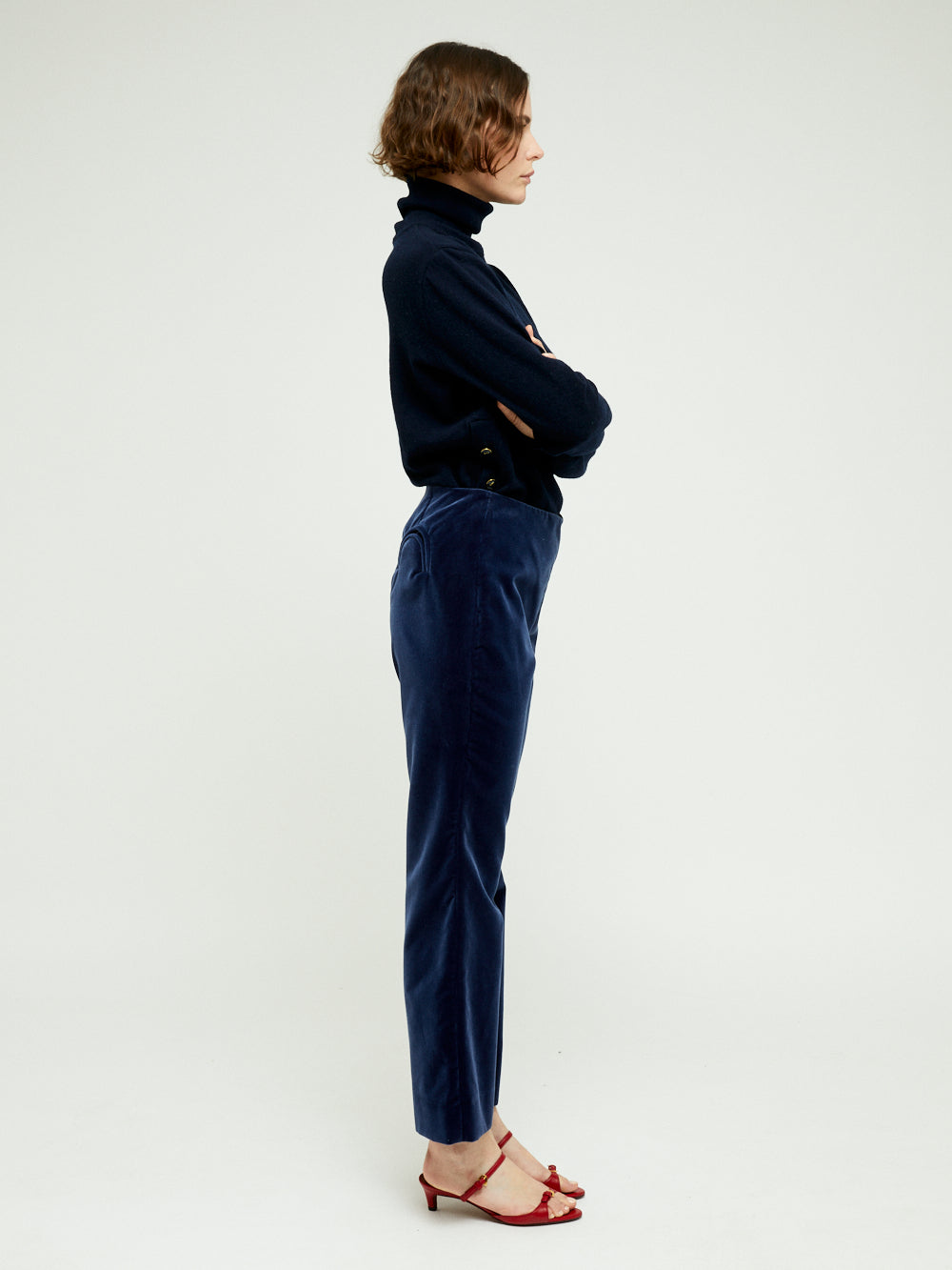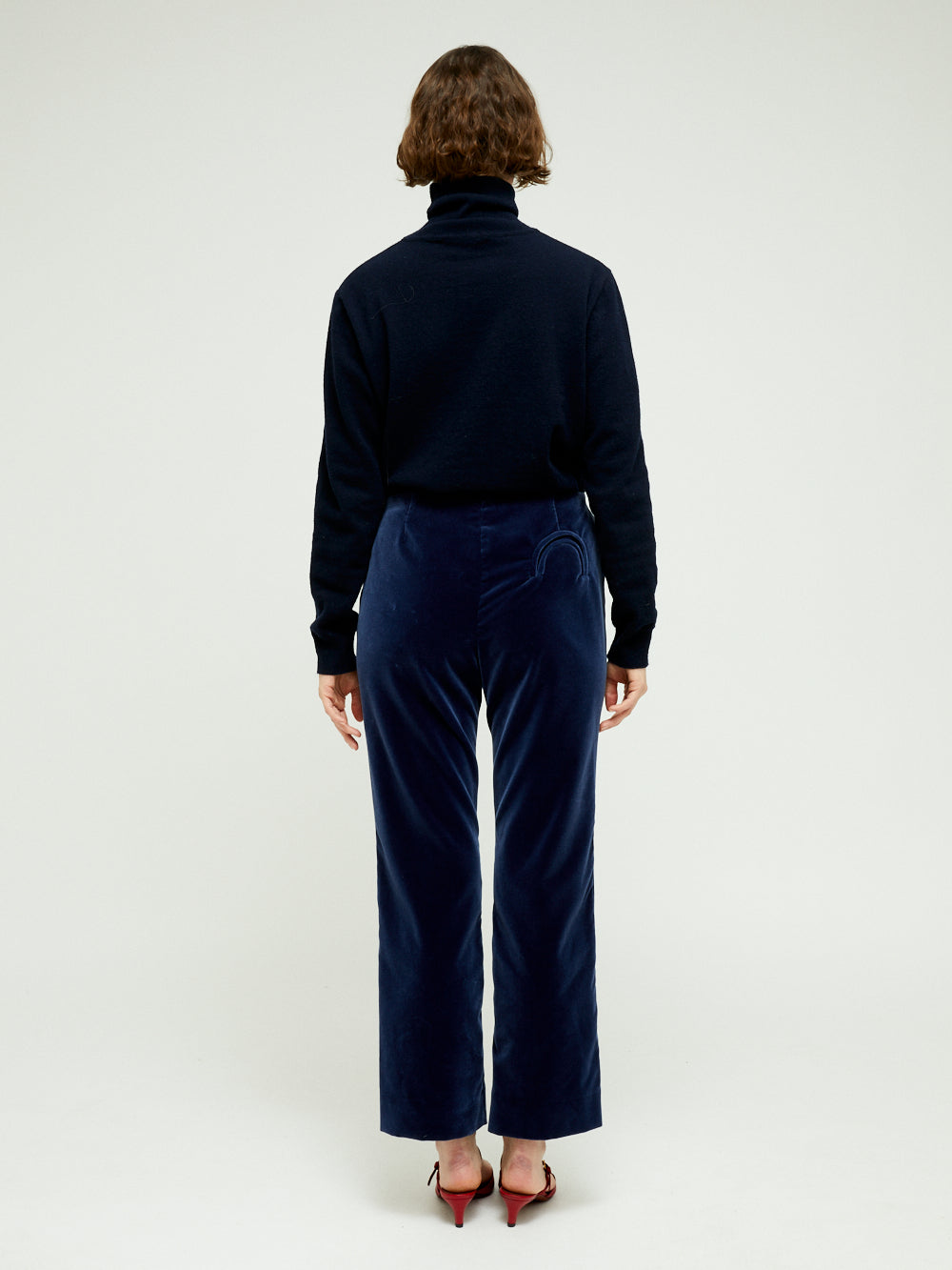 Pantalon Jealousy Morelia signé Blazé Milano confectionné en velours bleu nuit. Un pantalon légèrement évasé et à la taille mi-haute.