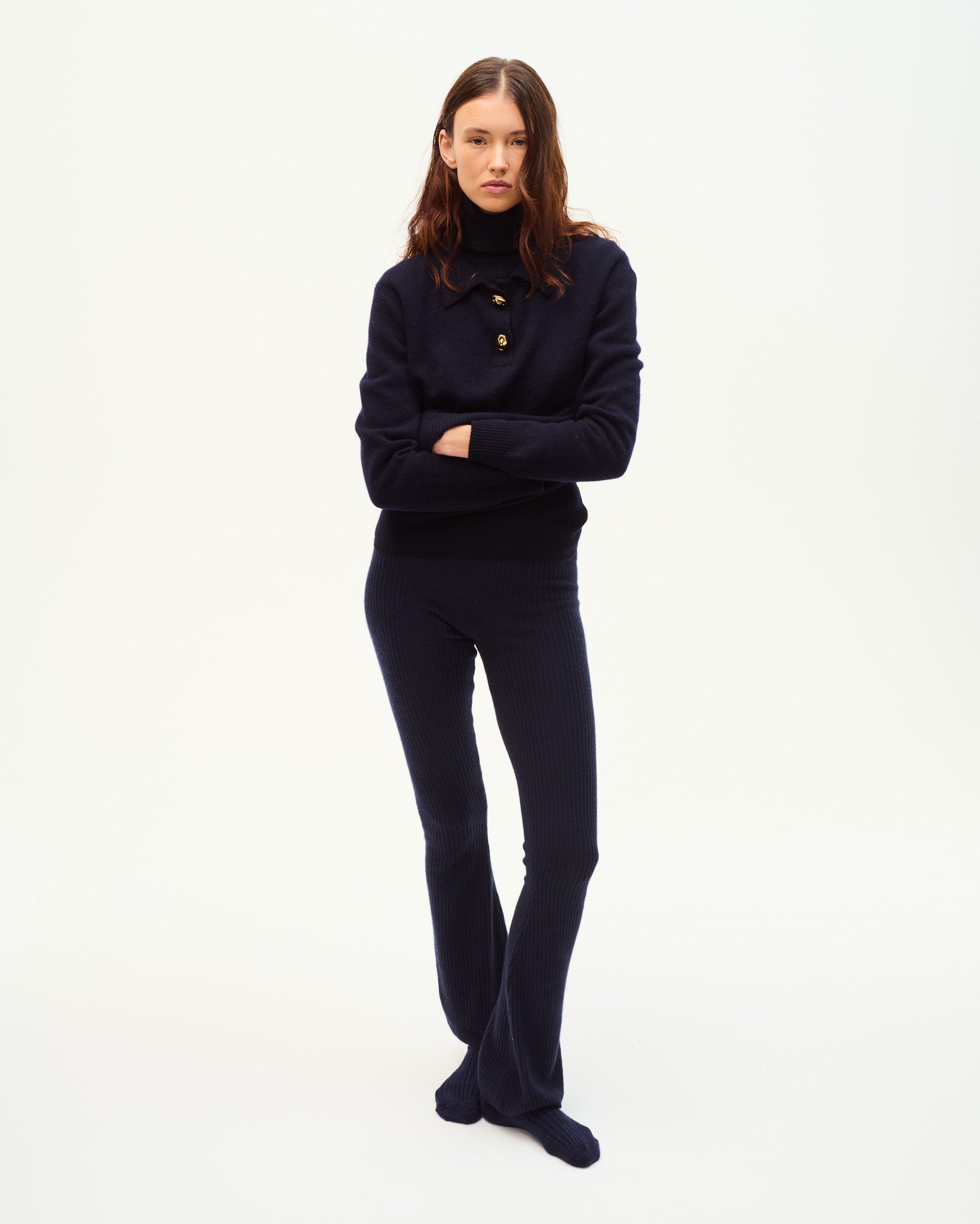 Polo Mateo Navy signé BY Marie Collection confectionné dans un mélange de cachemire et de laine de couleur bleu marine et décoré de boutons dorés à l'or fin issus de la collection Cophea dessinés et élaborés par les ateliers Gas Bijoux à Marseille. Un polo à la coupe courte et au col en V accompagné de boutons dorés à l'or fin.