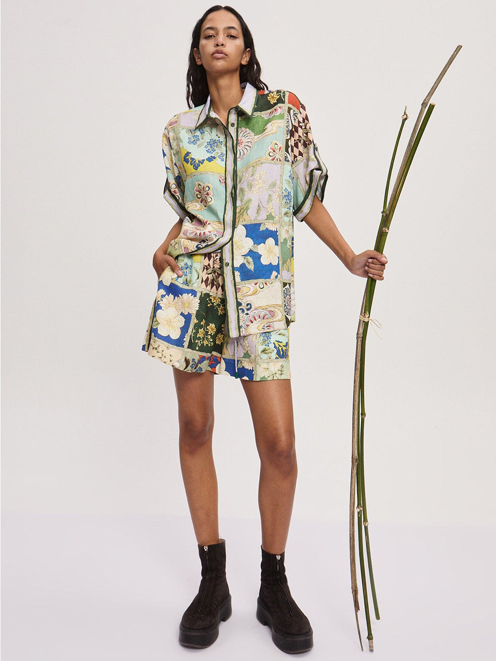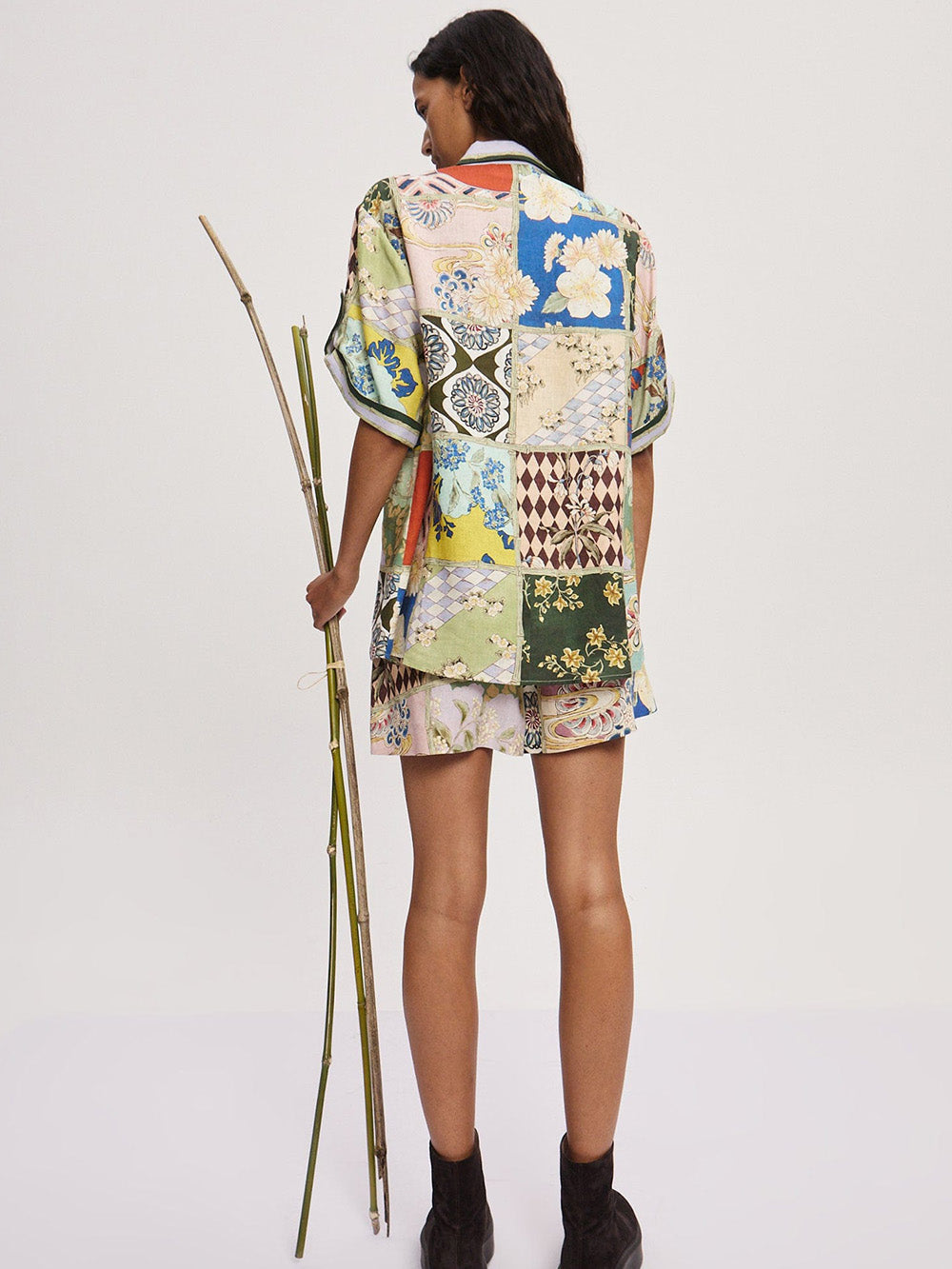 Chemise Bianca signée Alémais confectionné en lin imprimé de motifs s'inspirant de la peinture sur faïence. Une chemise à la coupe droite et aux manches retroussées.