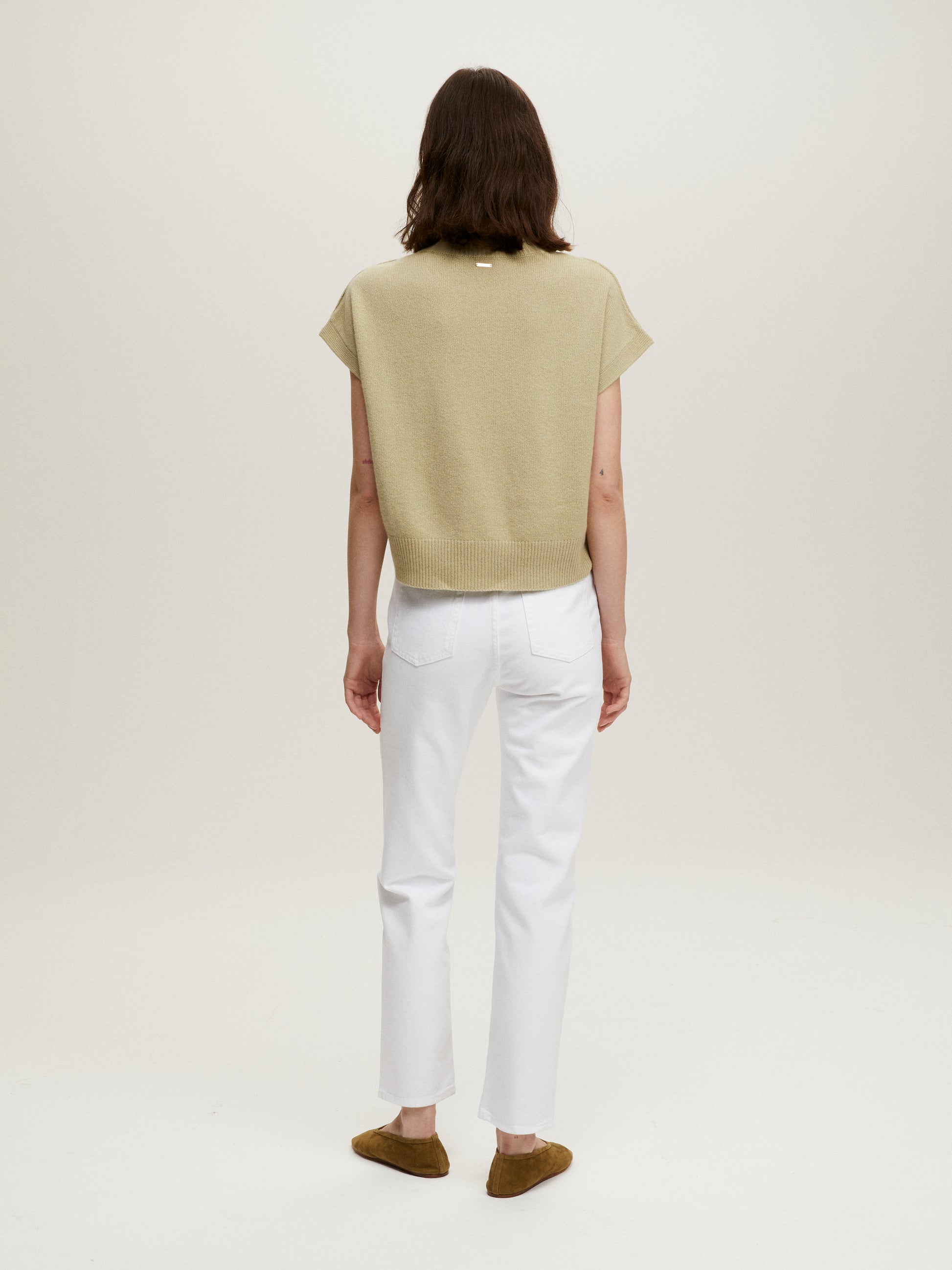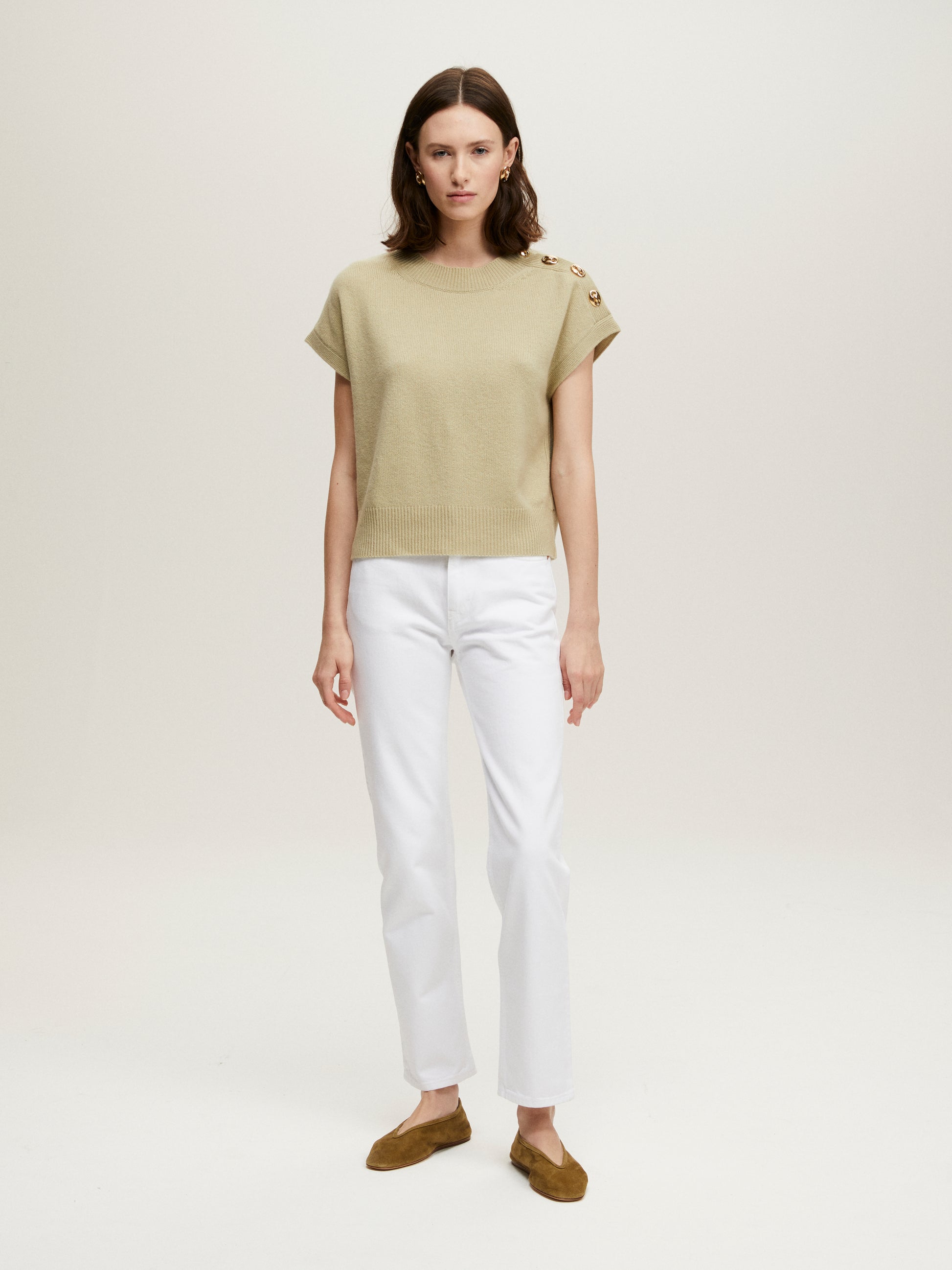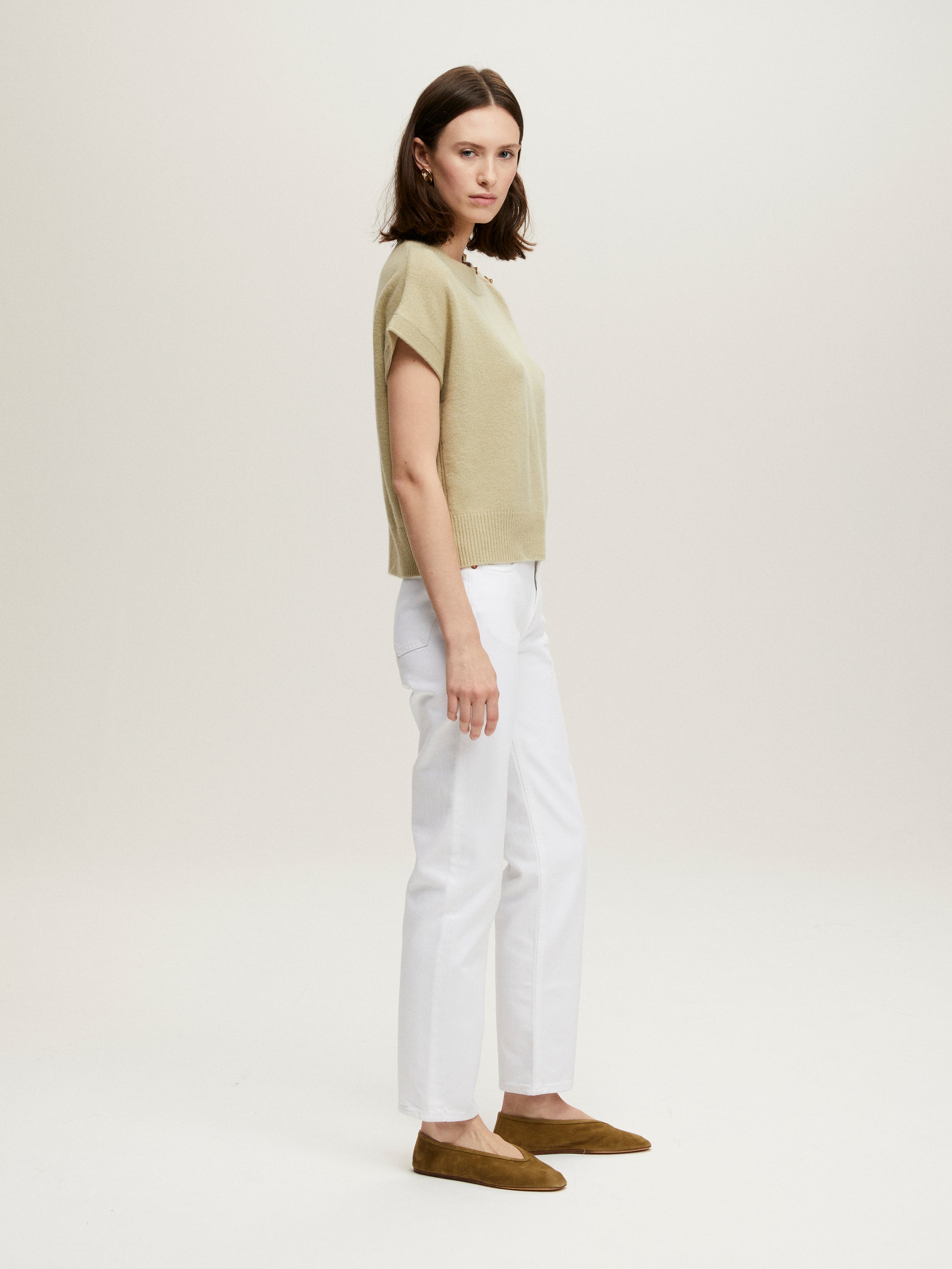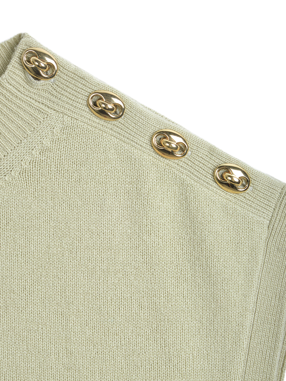 Pull Mini Gregor signé BY Marie Collection confectionné dans un mélange de laine et cachemire de couleur vert amande. Les cachemires BY MARIE sont réalisés en série limitée à la main et à l’aide d’une machine à tricot ancienne dans une organisation au Népal qui existe depuis 20 ans. Cette entreprise est composée essentiellement de femmes et comme nous, a à coeur la transmission d’un savoir faire de qualité.