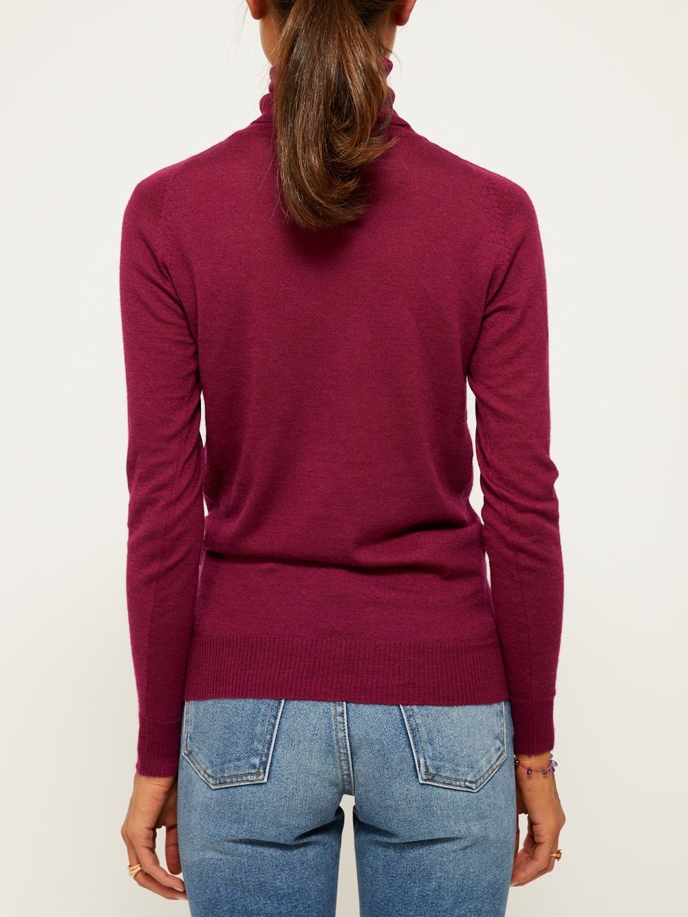 Pull Romy BY MARIE Collection. Ce pull col roulé fin en 100% cachemire se porte à même la peau. Une plaque dorée embossée du logo BY MARIE est cousue au dos du col.