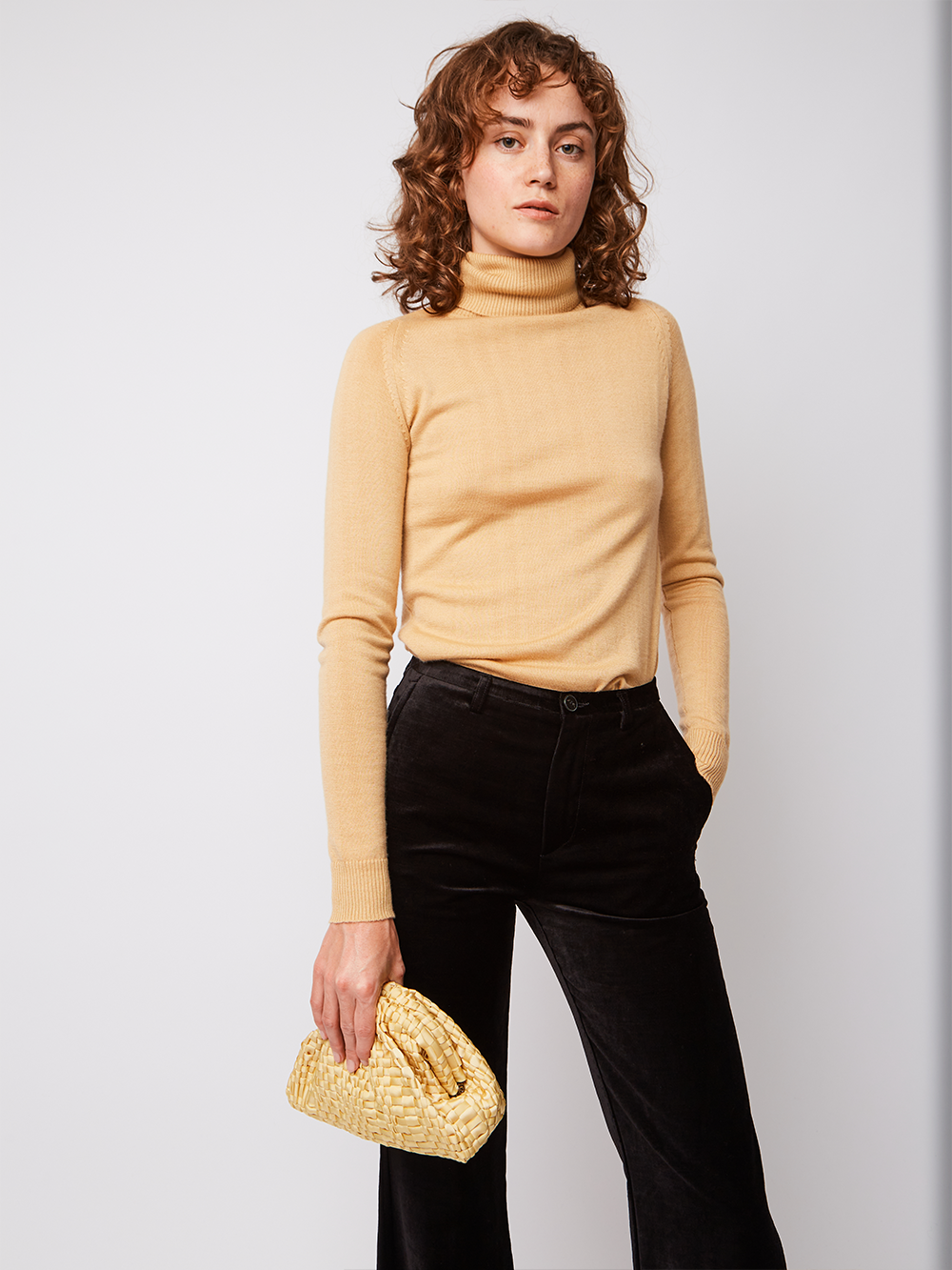Pull Juliette BY MARIE Collection. Ce pull col roulé en 100% cachemire 4 fils a une coupe près du corps. Une plaque dorée embossée du logo BY MARIE est cousue au dos du col. Les cachemires BY MARIE sont réalisés en série limitée à la main et à l’aide d’une machine à tricot ancienne dans une organisation au Népal qui existe depuis 20 ans. Cette entreprise est composée essentiellement de femmes et comme nous, a à coeur la transmission d’un savoir faire de qualité.