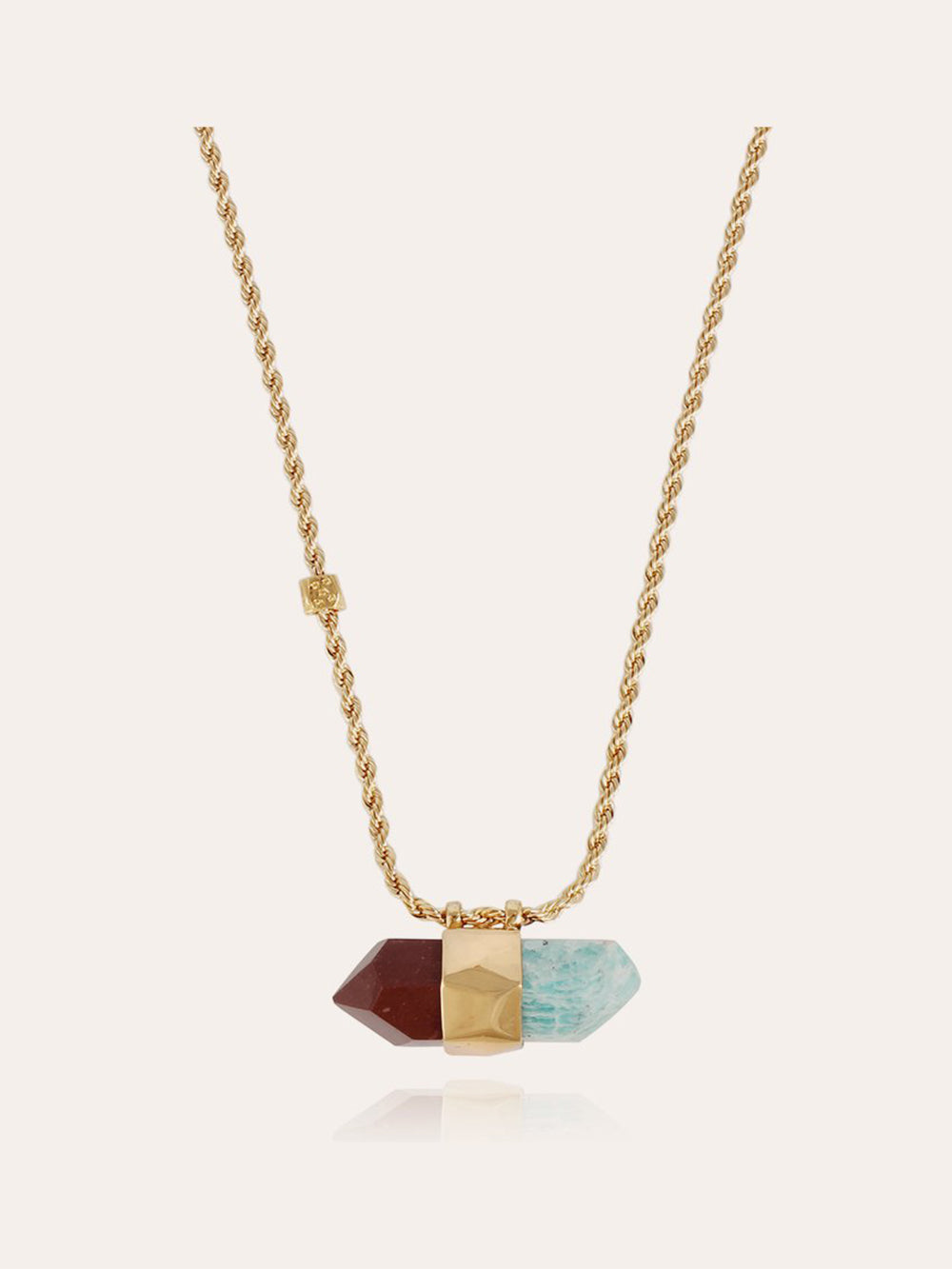 Ce collier Aventurine réalisé par Gas Bijoux est composé d'une chaîne torsadée dorée à l'or fin et d'un pendentif serti de deux pierres fines de Jaspe rouge et Amazonite taillées et réunies en deux fragments.