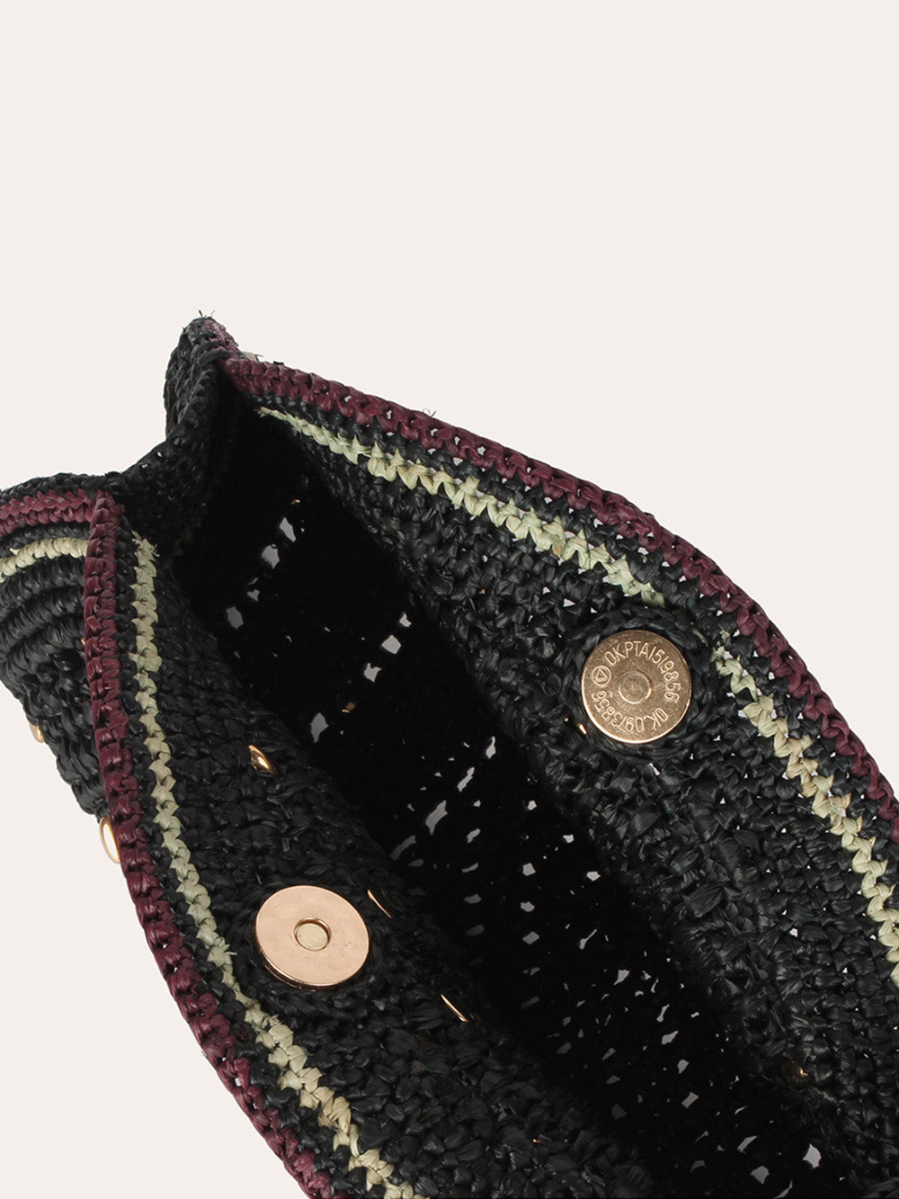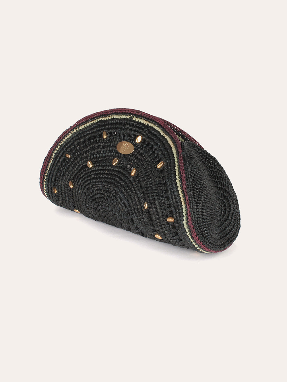 La pochette iconique réalisée artisanalement en raphia par Gas Bijoux s'orne cette saison de délicates graines dorées à l'or fin.