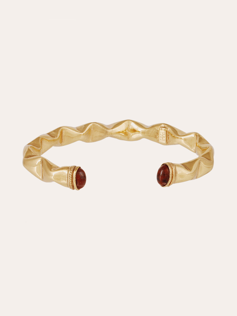 Ce bracelet Moki realisé par Gas Bijoux est un jonc doré à l'or fin aux courbes ondulées, habillées de fins cabochons colorés aux extrémités.