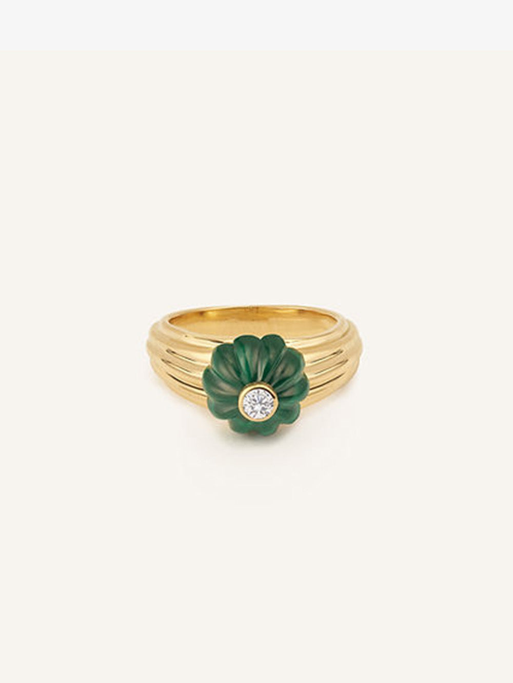 Cette bague Gelato malachite et diamant est imaginée par la créatrice Salomé Rico. Elle se compose d'un half melon cut en malachite avec cabochon en diamant et d'un anneau en or jaune godronné 18 carats. Réalisée à la main à Paris, cette pièce forte reflète l'ADN de la maison.