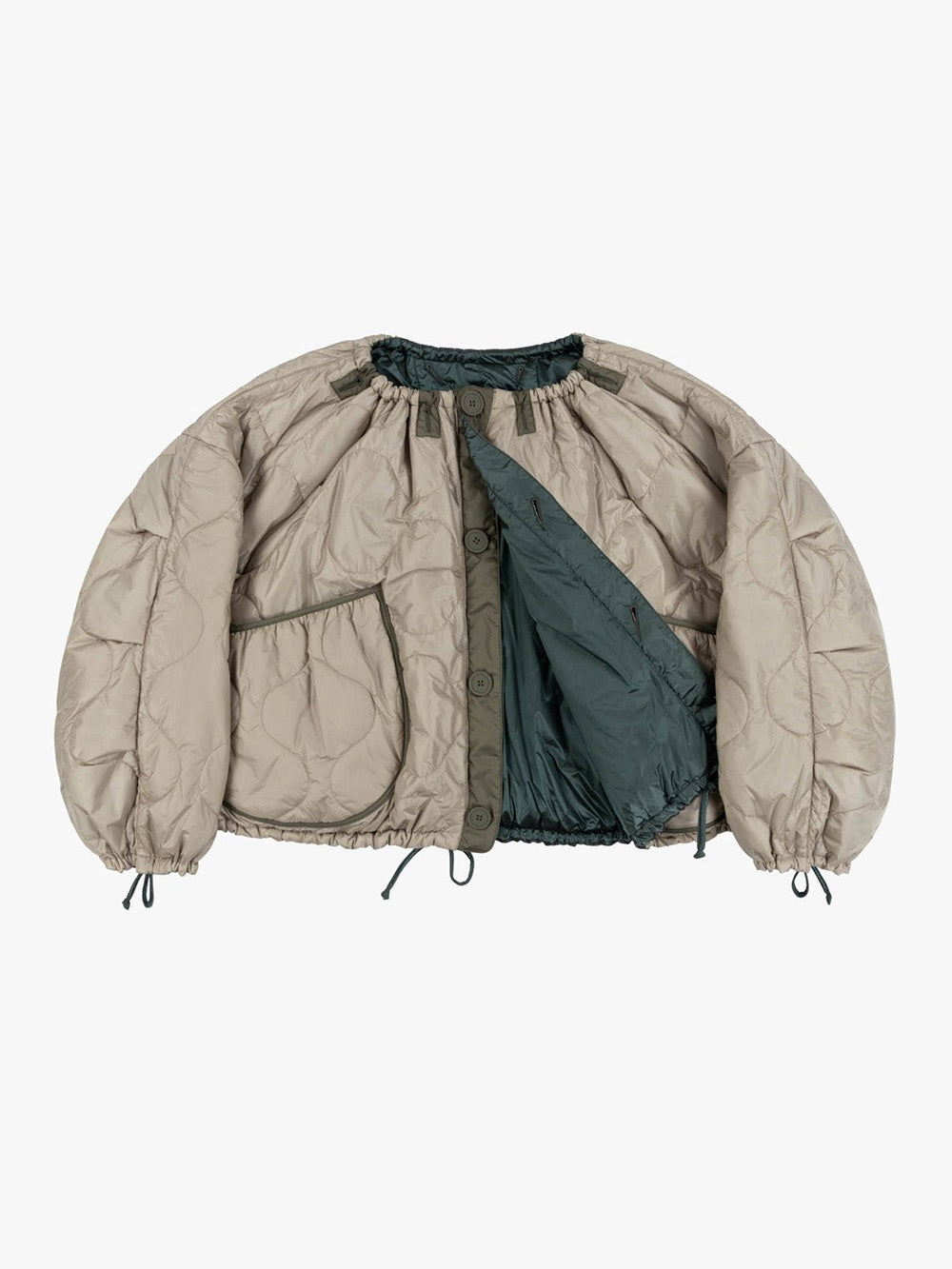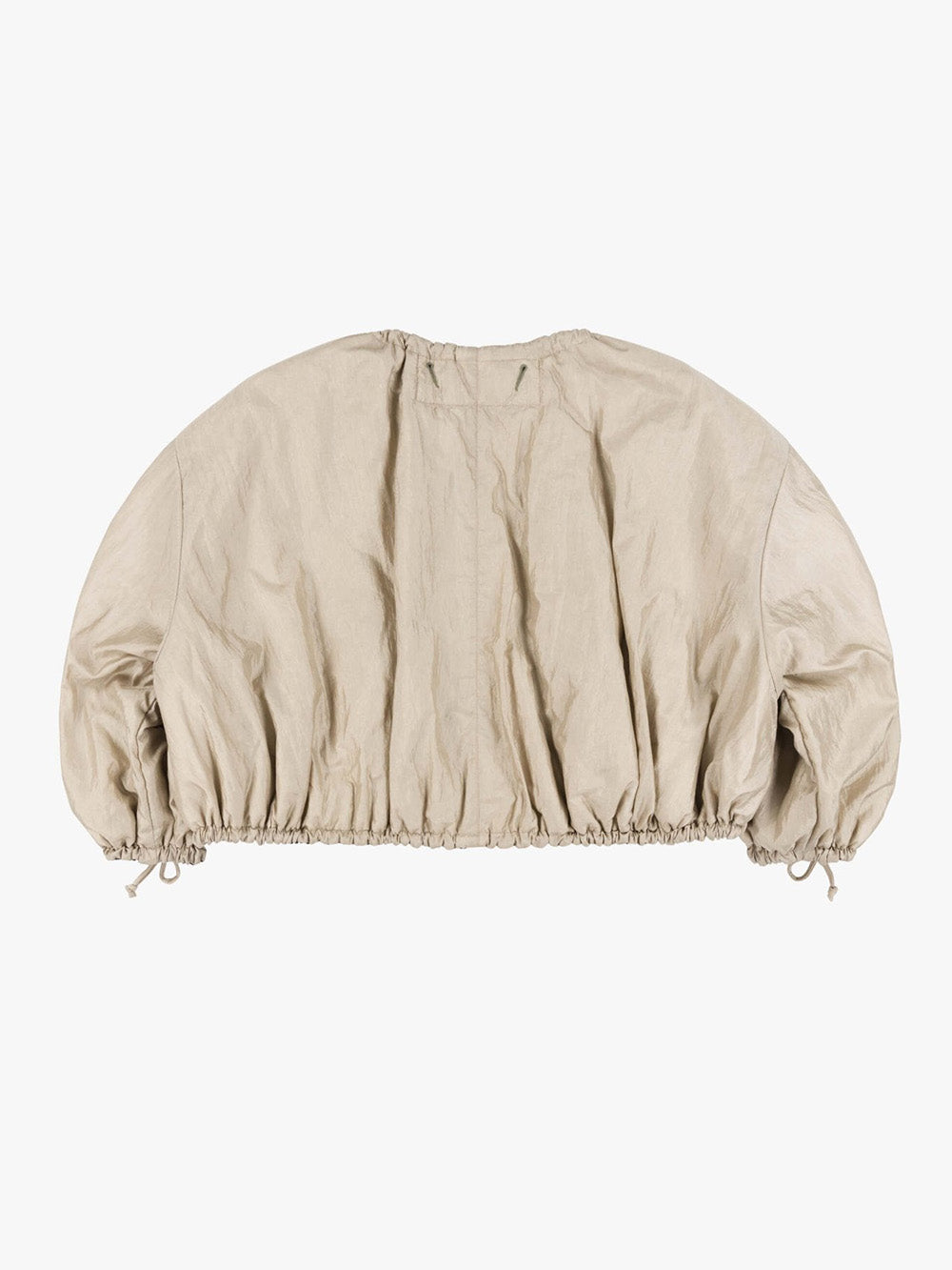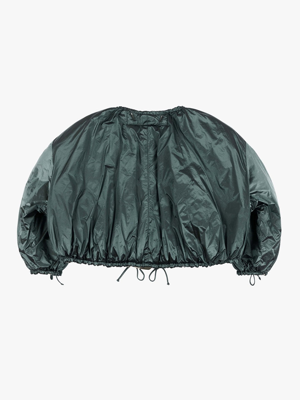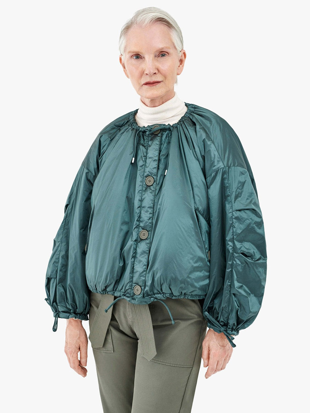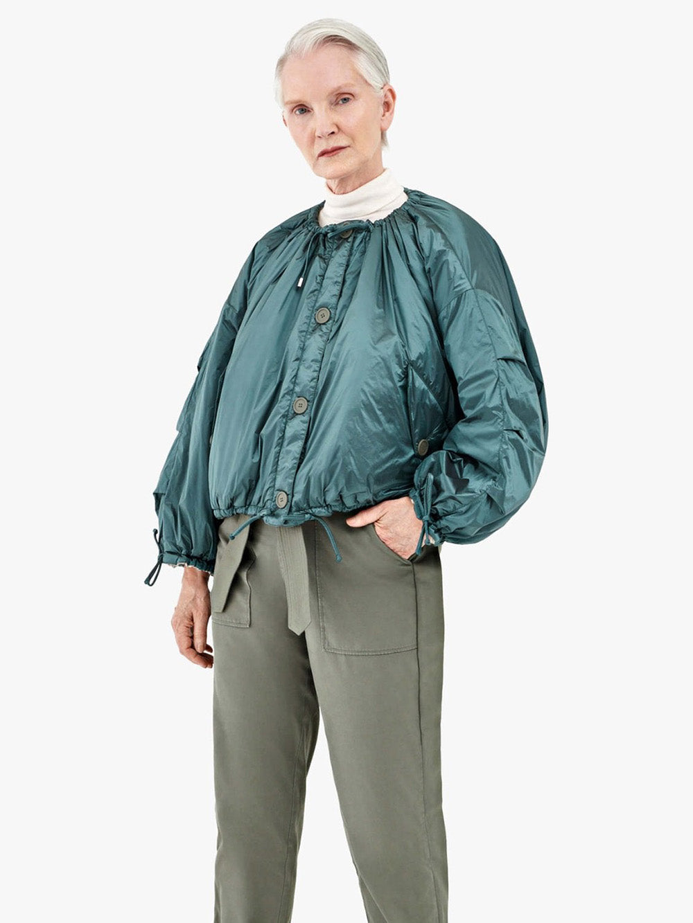 Bomber Parachute signé Marfa Stance confectionné grâce à des chutes de tissus de collections passées réutilisées. Une coupe courte réversible avec un côté gris clair et un côté pétrole.