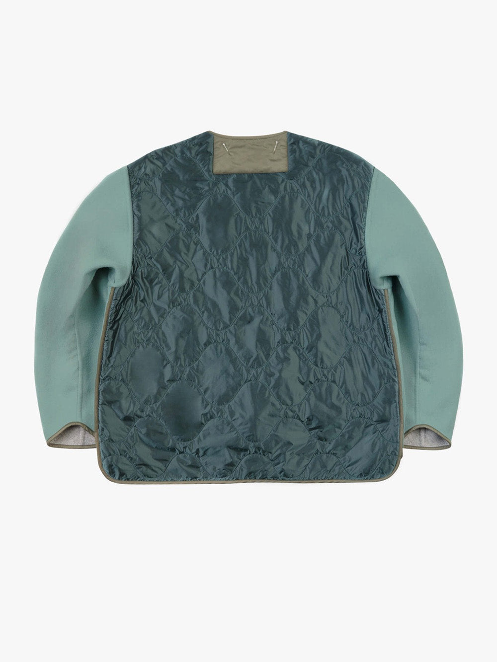 Caban en Laine signé Marfa Stance confectionné en laine et en nylon italiens dans les tons bleu, pétrole et sauge. Un caban revisité avec des pans en nylon matelassé pour un effet bomber.