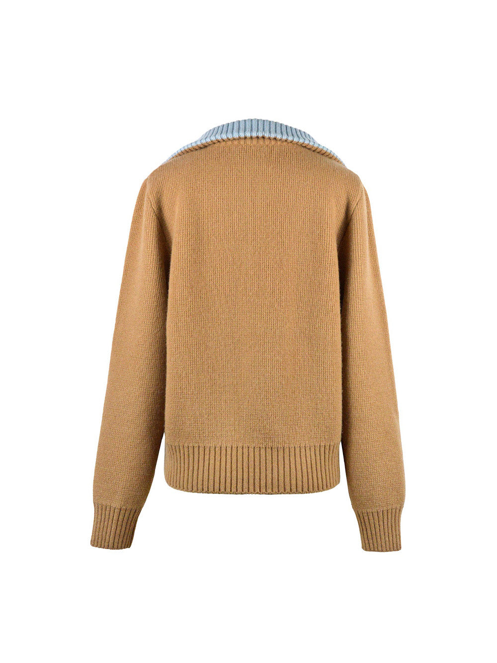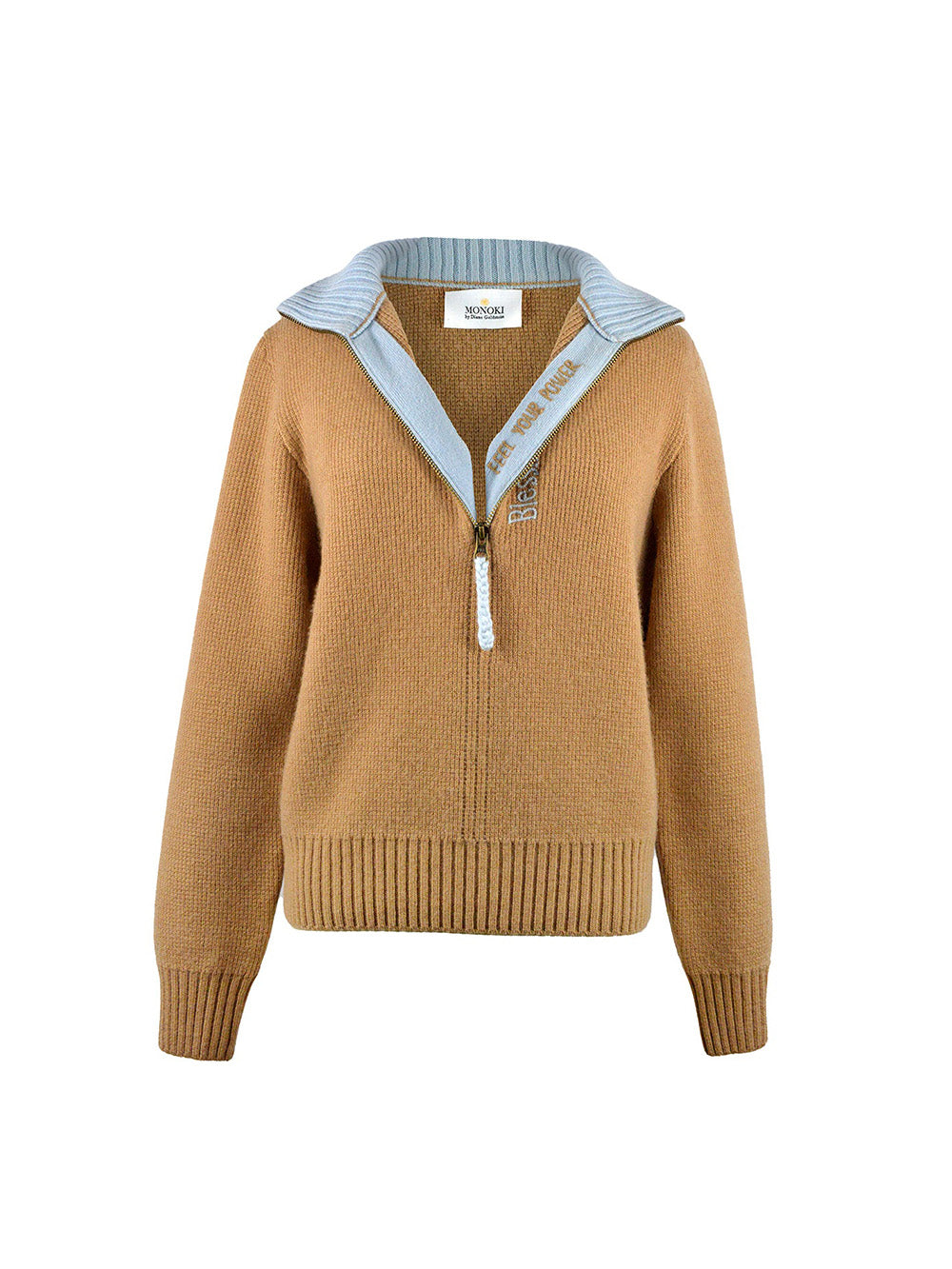 Pull Truck signé Monoki confectionné en cachemire camel. Un pull au col zippé contrastant bleu clair brodé de l'inscription "feel the power". Une pièce tendance.