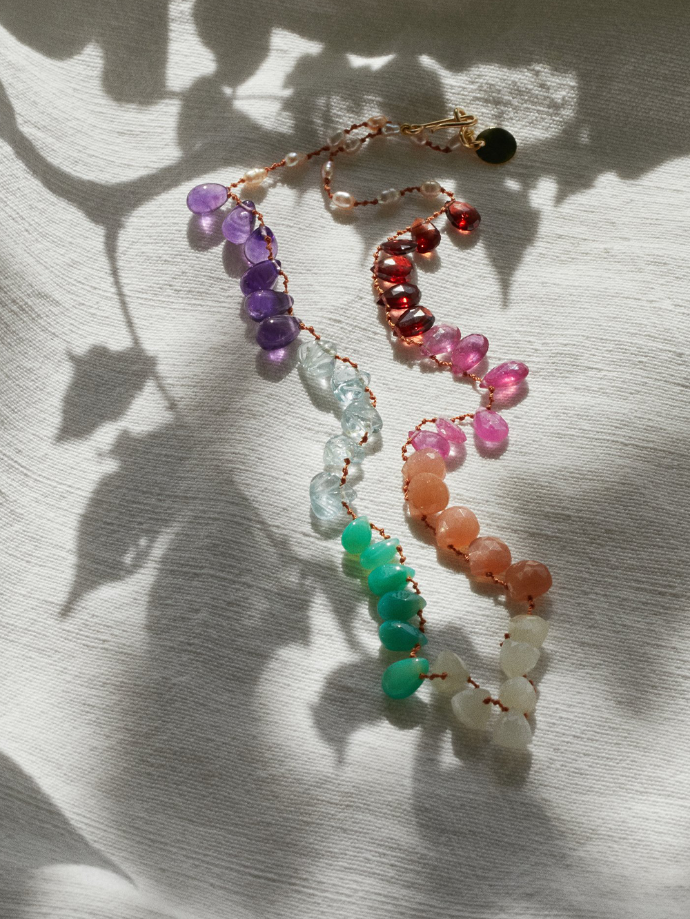 Le collier Rainbow signé Ivarene est réalisé à la main à Paris et se compose de perles d'eau douce, de grenats, de saphirs roses, de pierres de lune, chrysoprases, amazonites et améthystes. Les pierres sont attachées sur un cordon en nylon et en soie mesurant 44 cm. Ce collier s'attache à l'aide d'un fermoir "Infinity" en or 14 carats gold-filled.