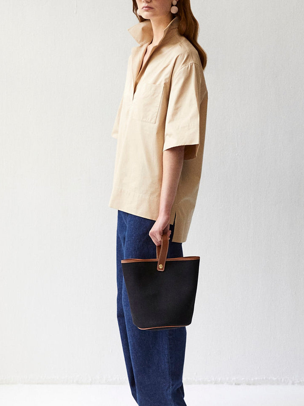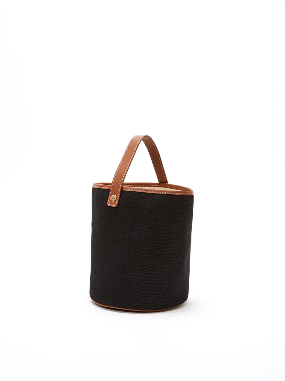 Sac Harbor Canvas signé Rue de Verneuil confectionné dans un canva en laine de couleur noir. Un sac seau chic aux bordures en cuir contrastant marron.