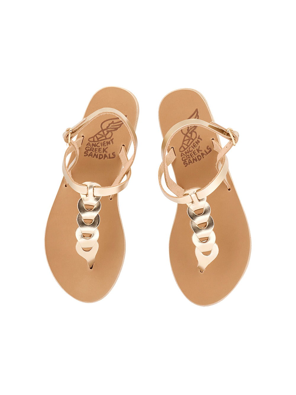 Sandales Lito Ancient Greek Sandals. Ces sandales en cuir beige se composent de liens entrelacés et s'attachent à la cheville par une bride et un fermoir en forme d'aile doré. La semelle en cuir à bout amande est renforcée par une semelle antidérapante. Chaque modèle de la marque Ancient Greek Sandals est fabriqué artisanalement en Grèce.