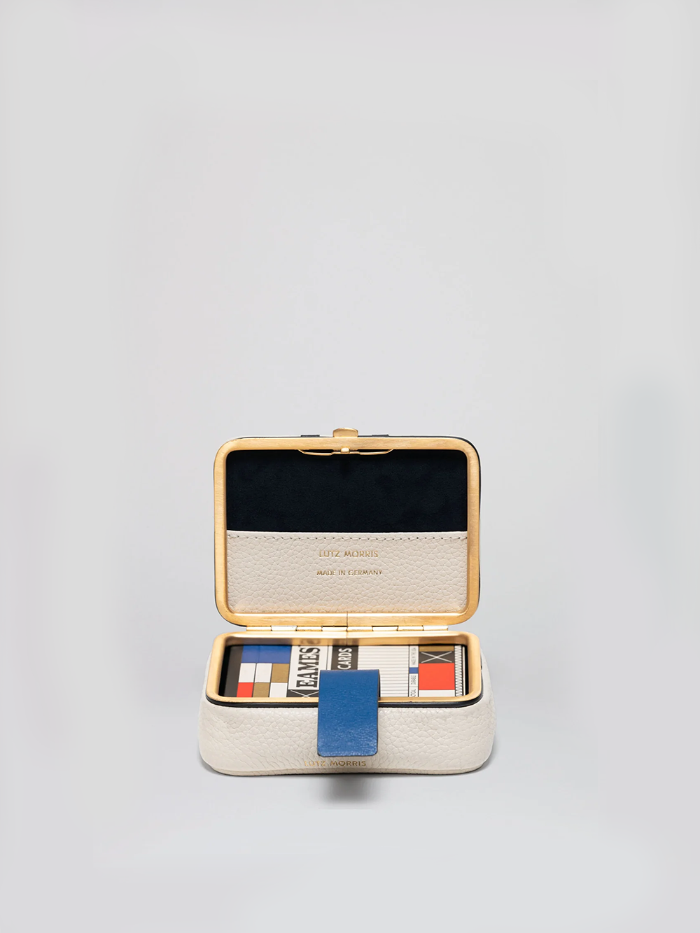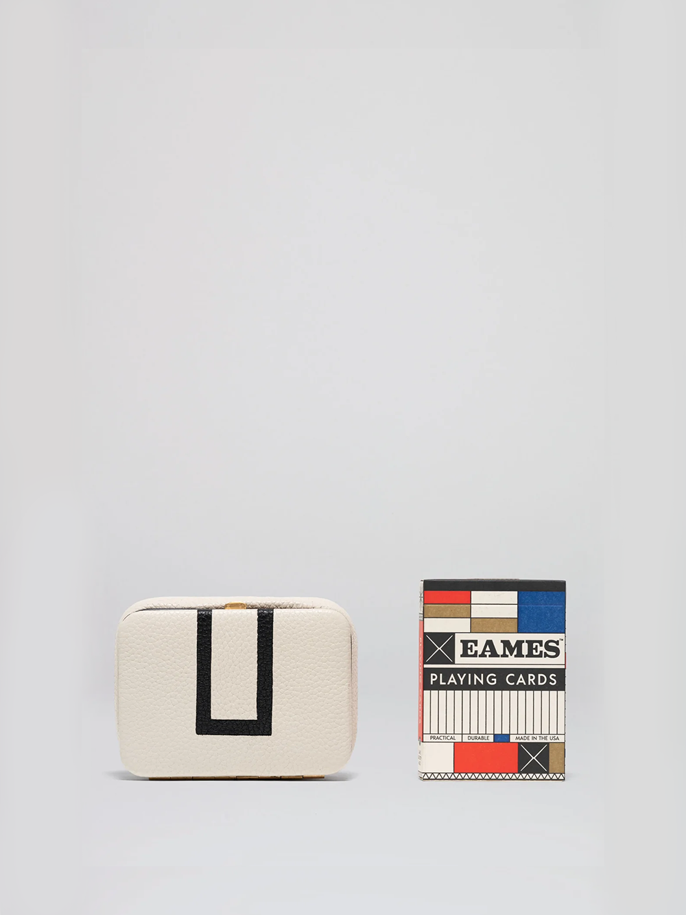 L'étui pour jeu de cartes Ness est réalisé en cuir de veau grainé par Lutz Morris. Il s'accompagne d'un jeu de 54 cartes au design inspiré de celui de Charles & Ray Eames.